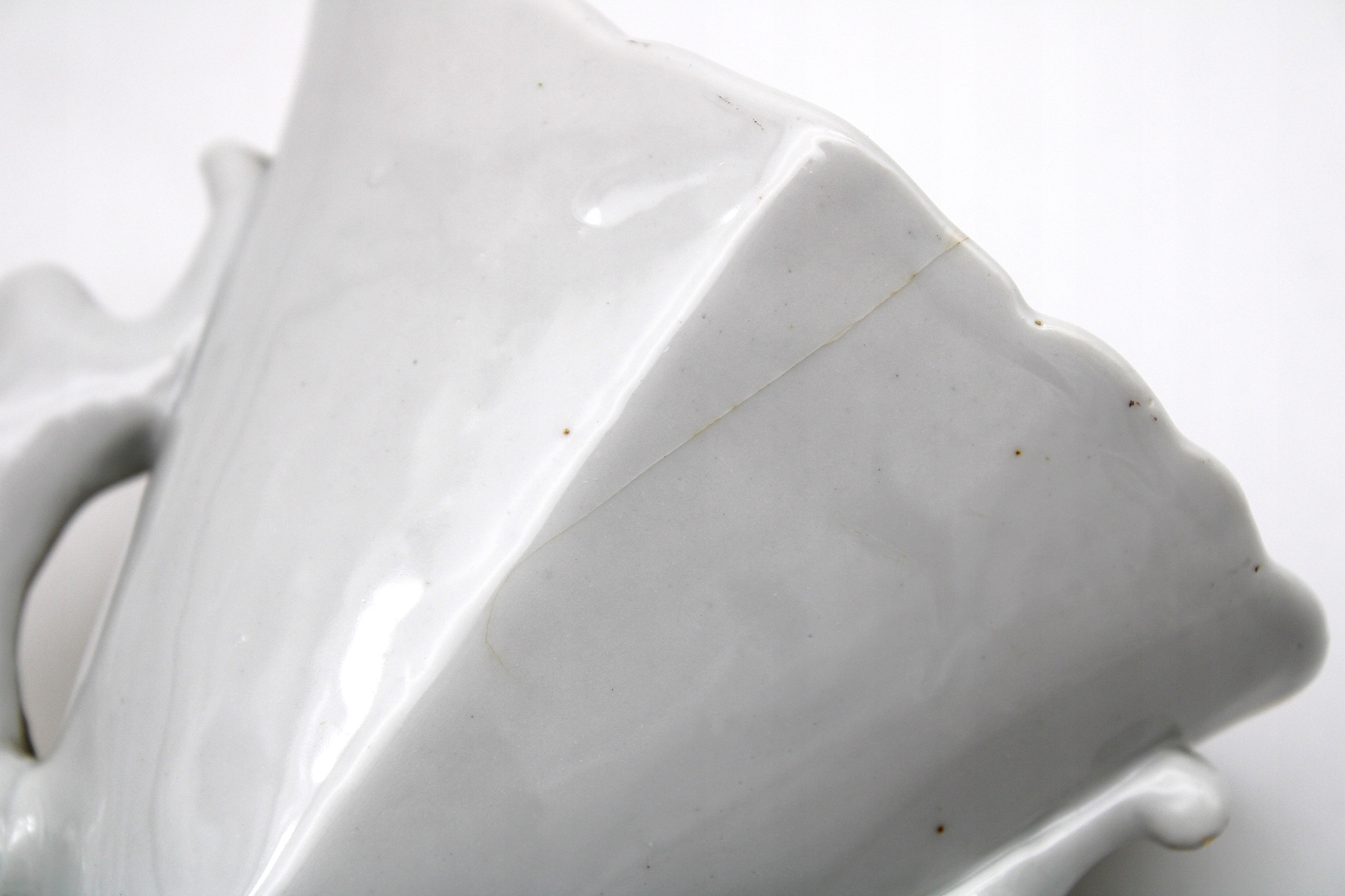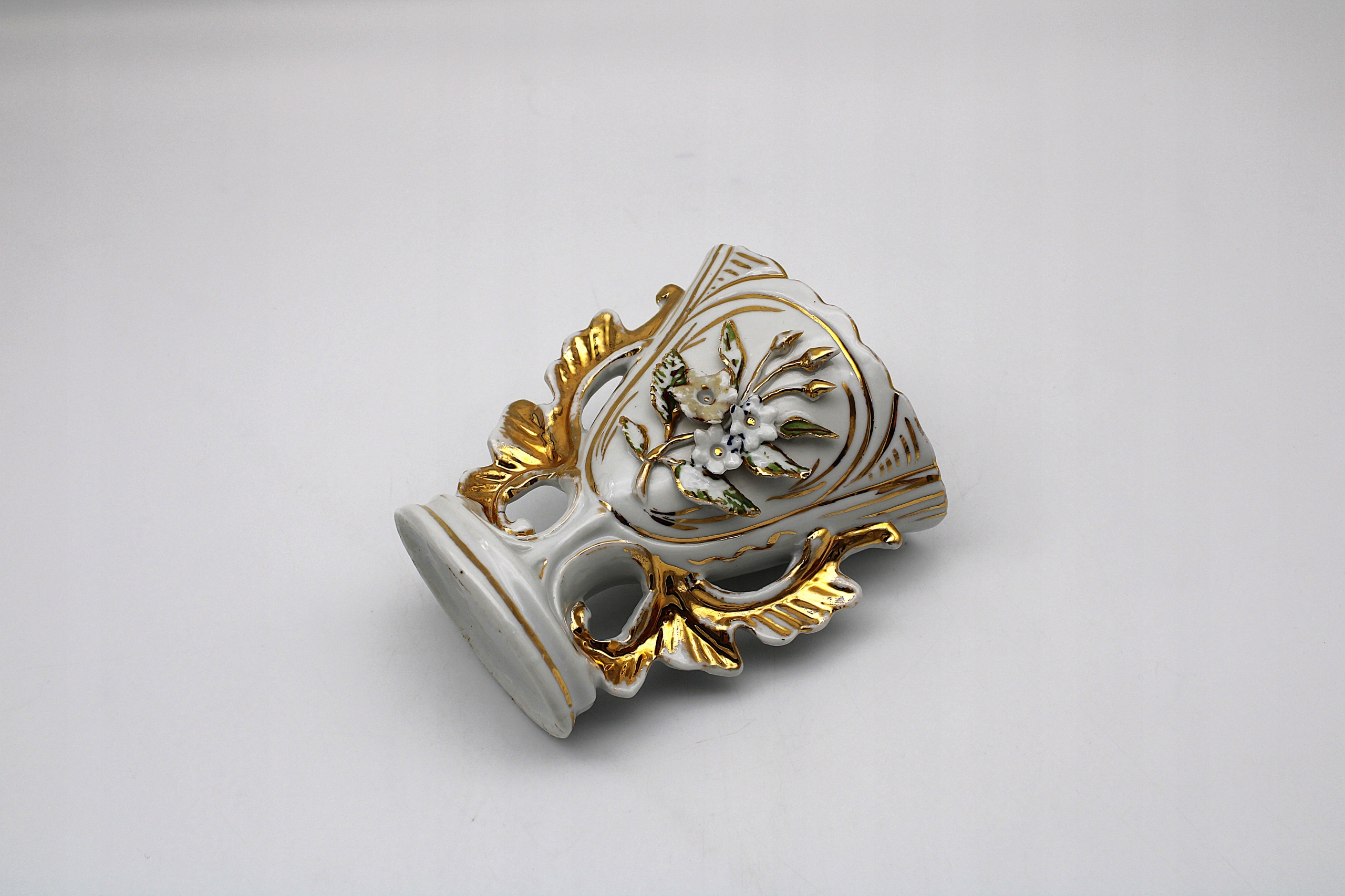 Я рекомендую старую древнюю вазу для свадебных букетов фарфора примерно с 1860 по 1880 годы, так как на сканировании она имеет естественное временное вытирание, естественные небольшие заводские недостатки и паук -паук, показанный на фото