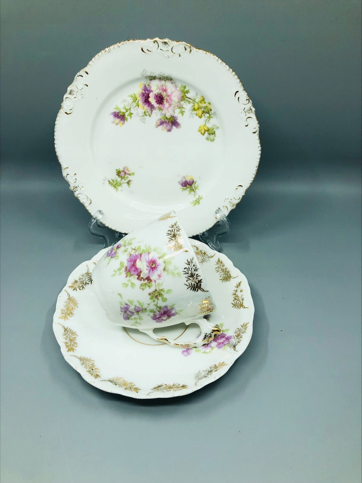 Белый фарфор, украшенный цветочными мотивами и позолотой, лепная и изысканная ручка, декоративные края подставки и десертной тарелки.
