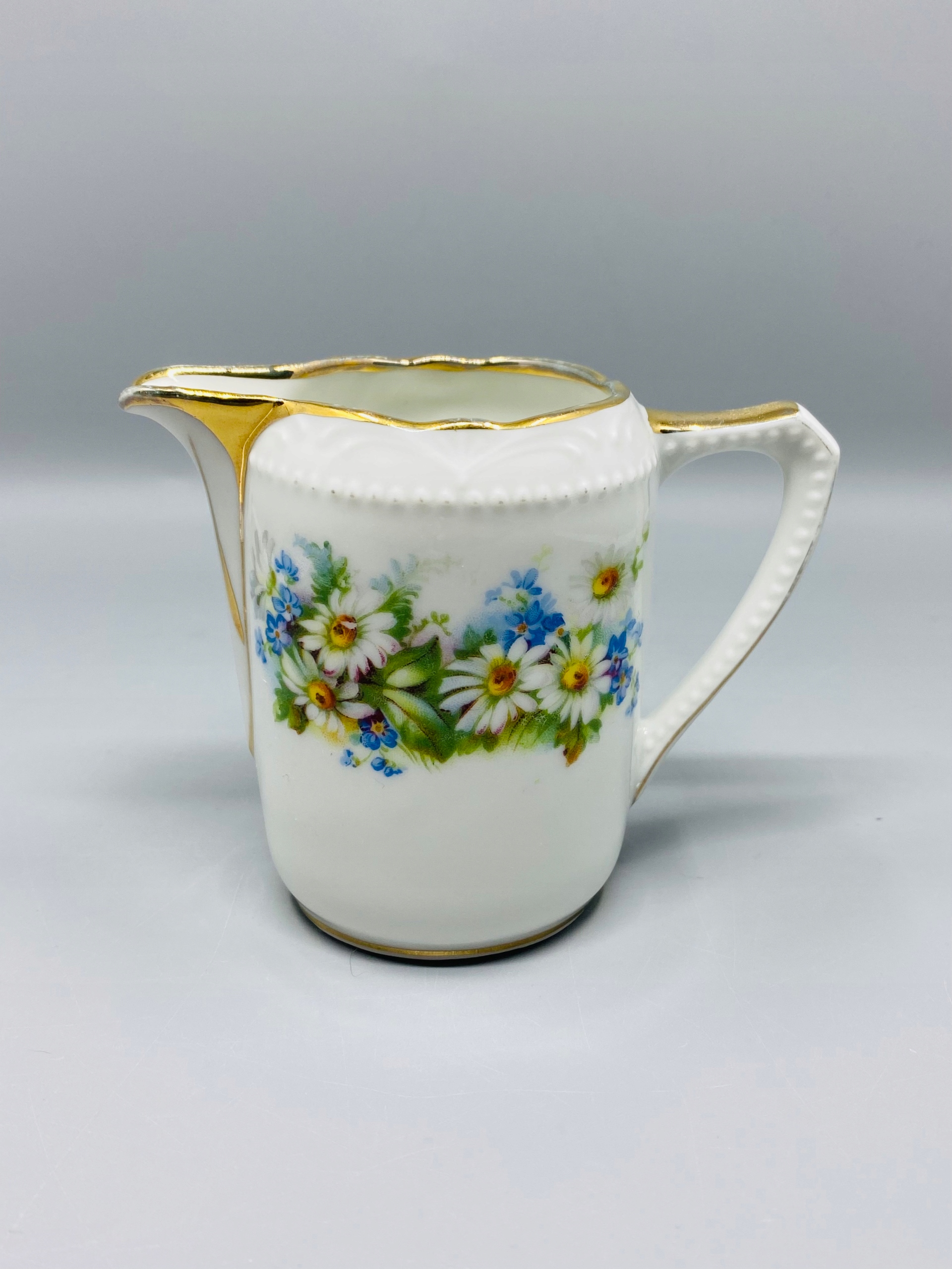 Белый фарфор с цветочной росписью, годичные позолоченные края, профилированная ручка. По краям точечное тиснение. Старый, довоенный фарфор.
