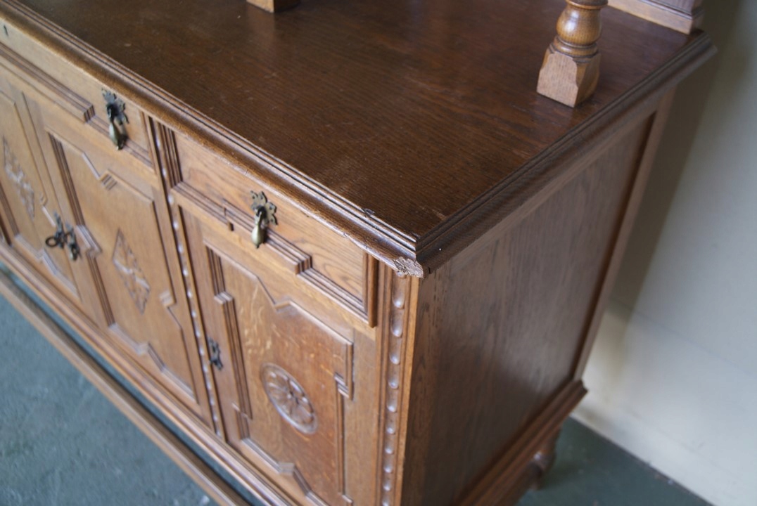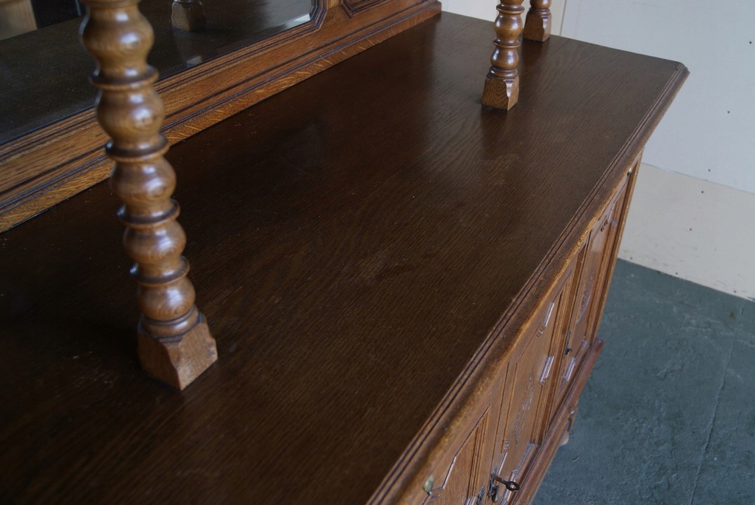 Состояние серванта видно на фотографиях, конструкция устойчивая, есть скол по краю верха.