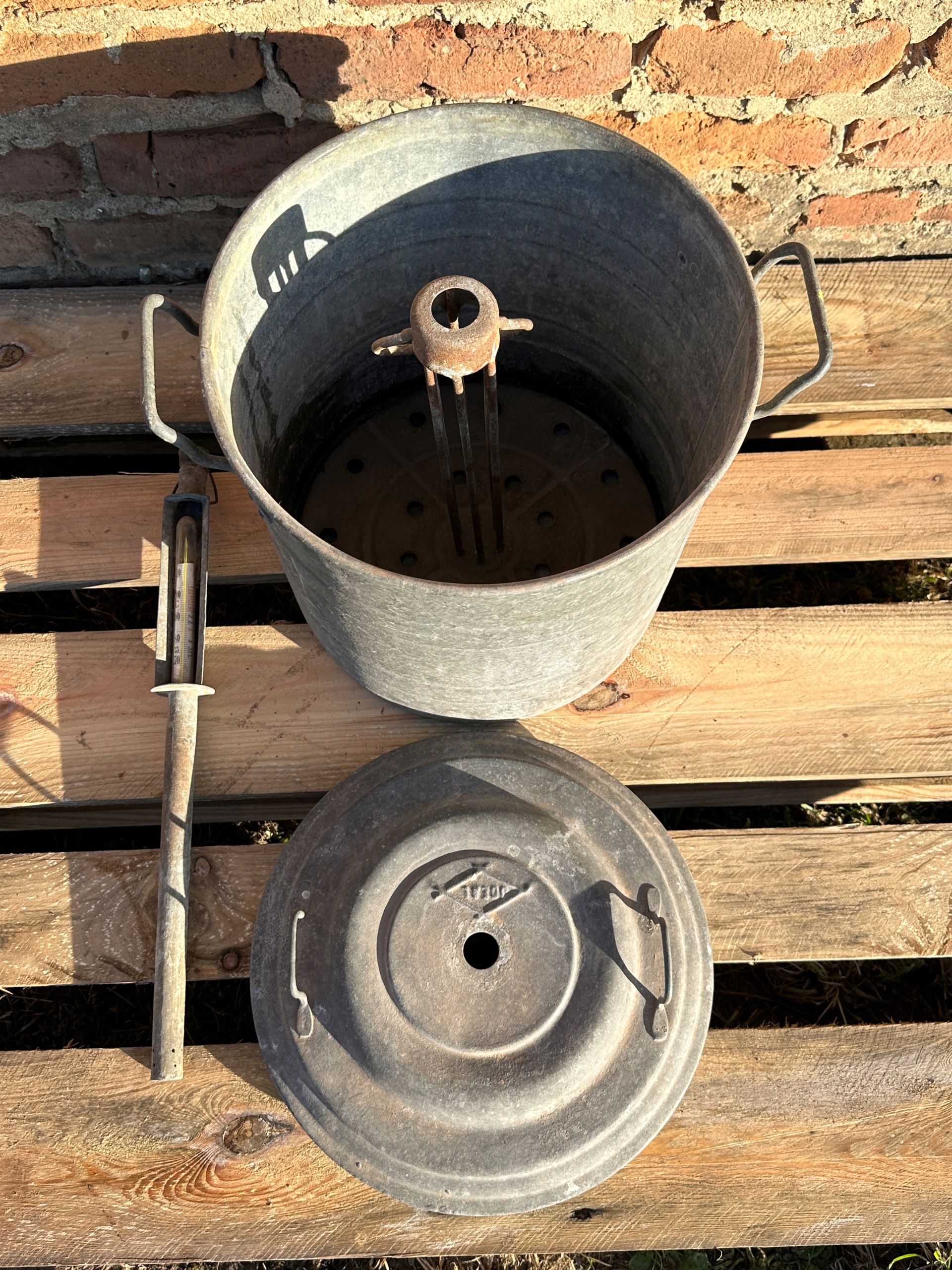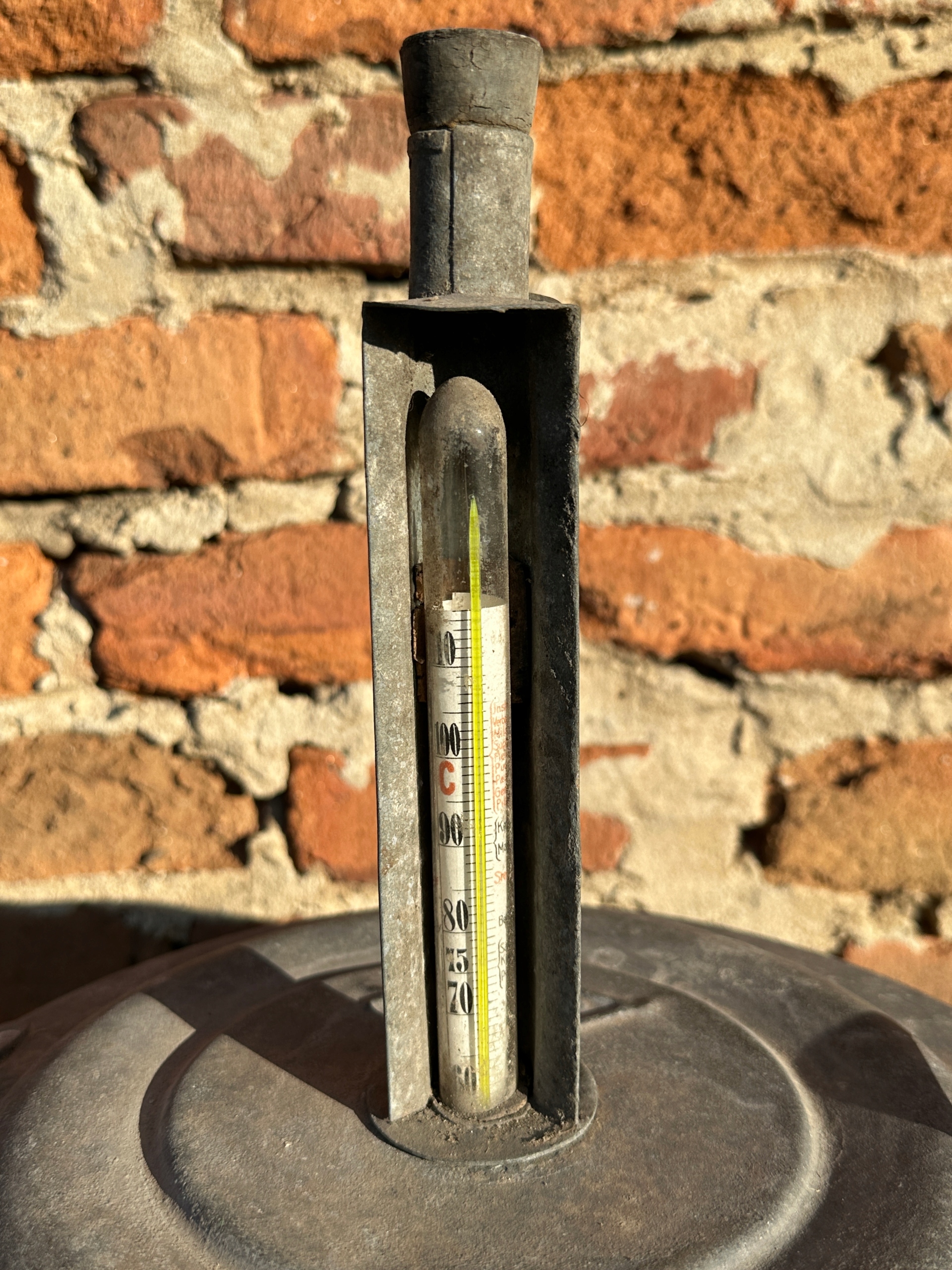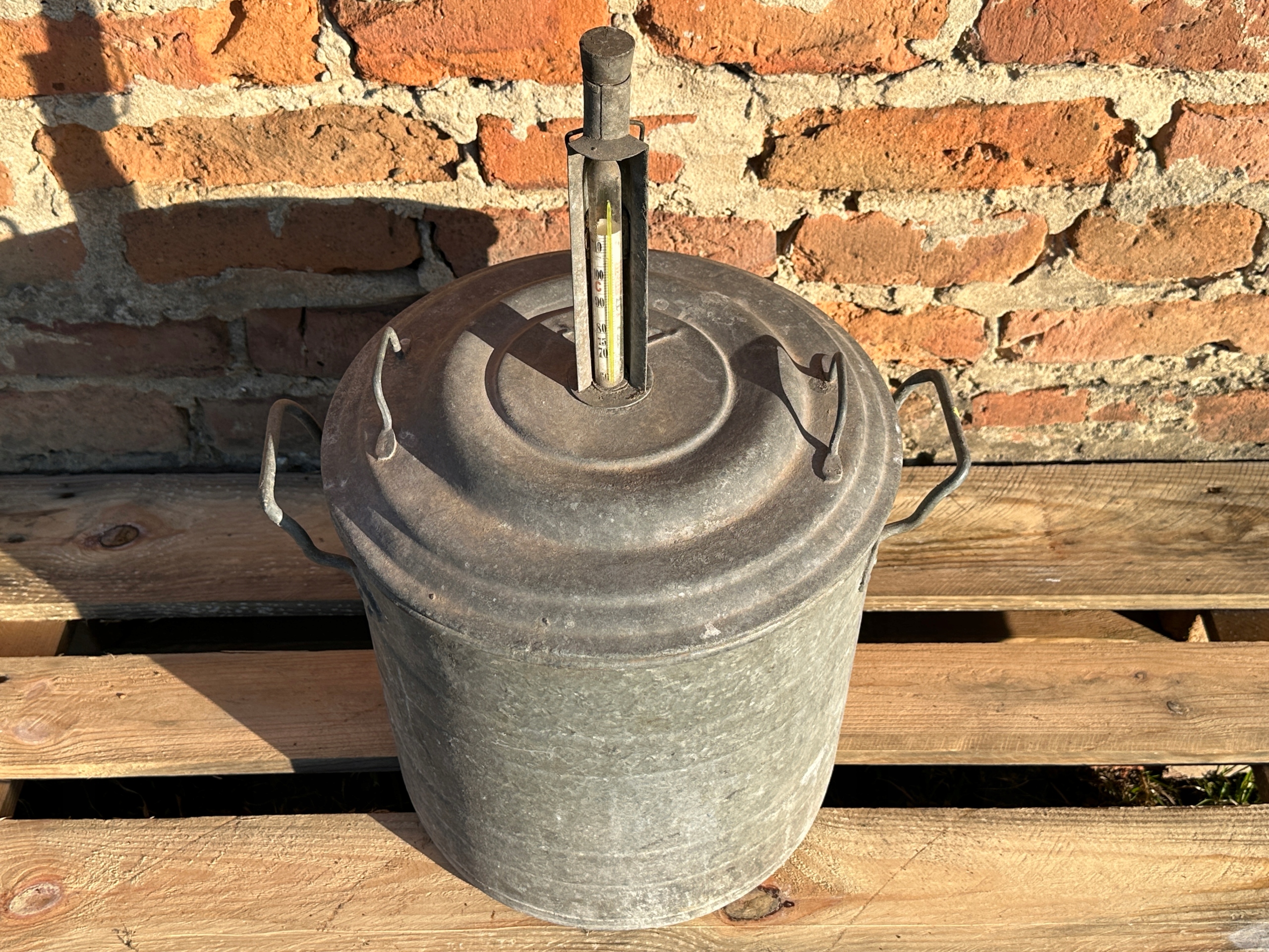 СТАРАЯ, ОРИГИНАЛЬНАЯ, ОЦИНКОВАННАЯ ЕМКОСТЬ ДЛЯ КОНСЕРВИРОВАНИЯ С ТЕРМОМЕТРОМ - ИДЕАЛЬНО