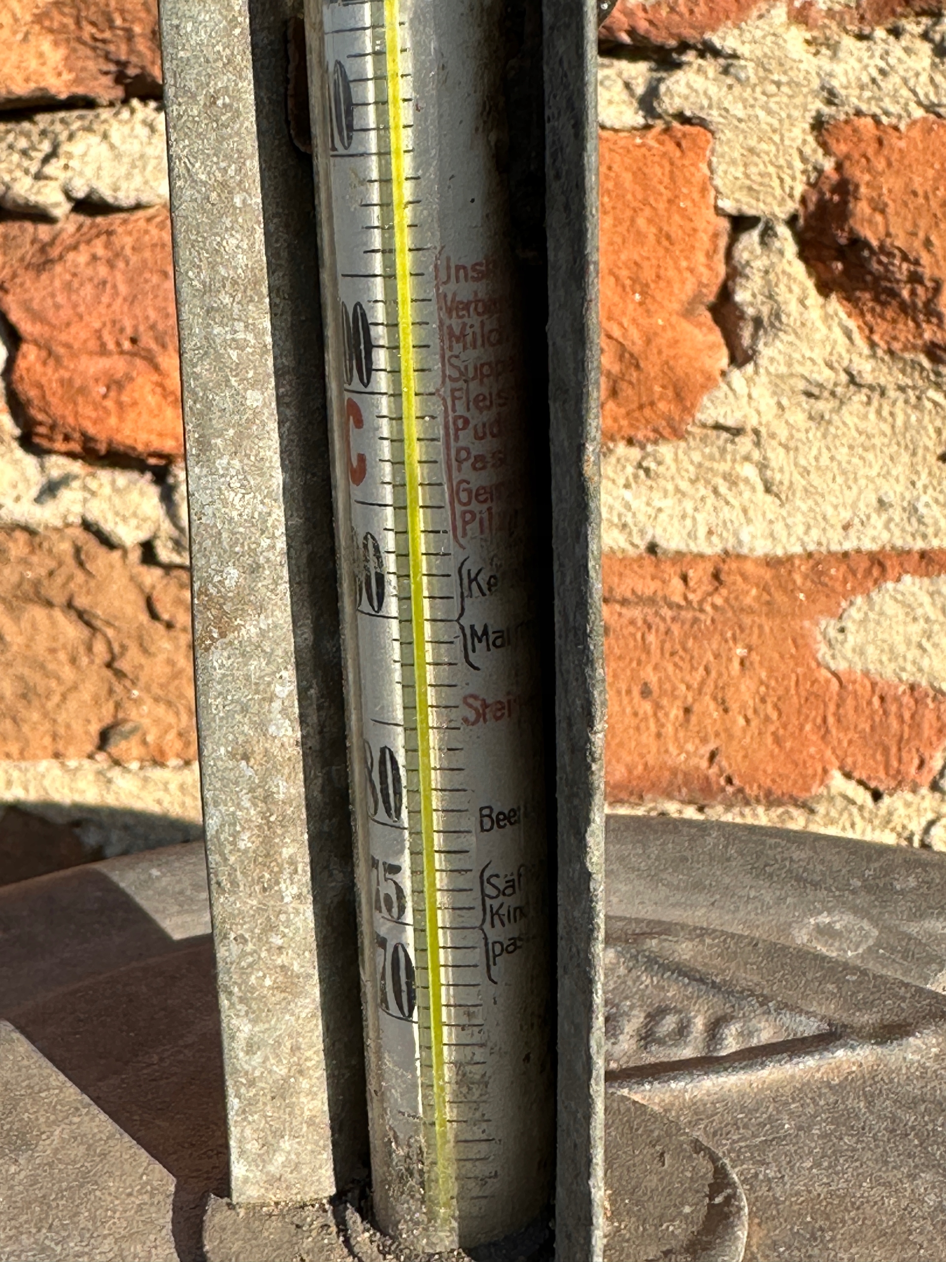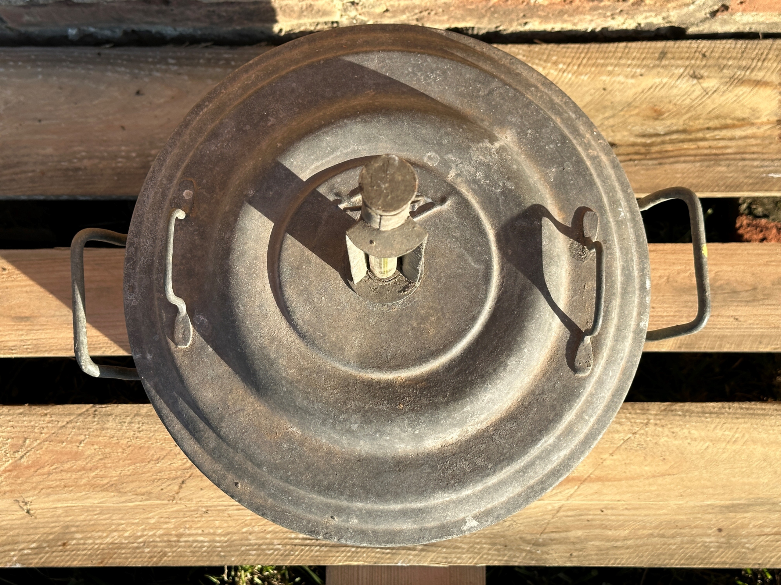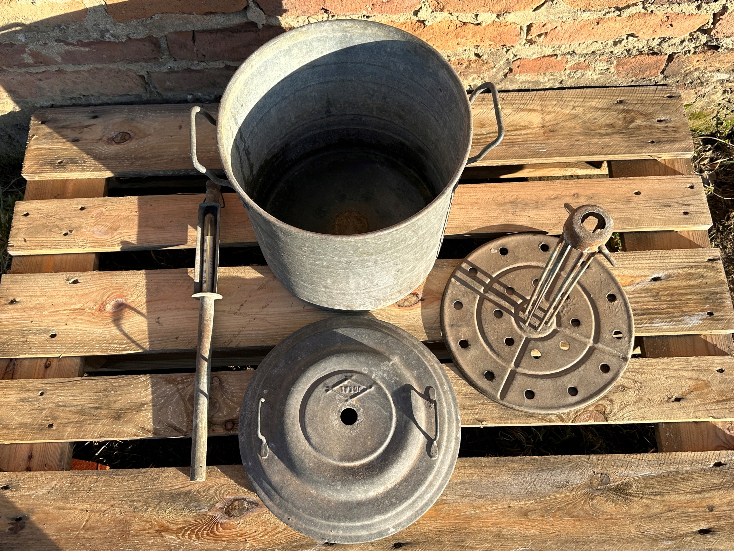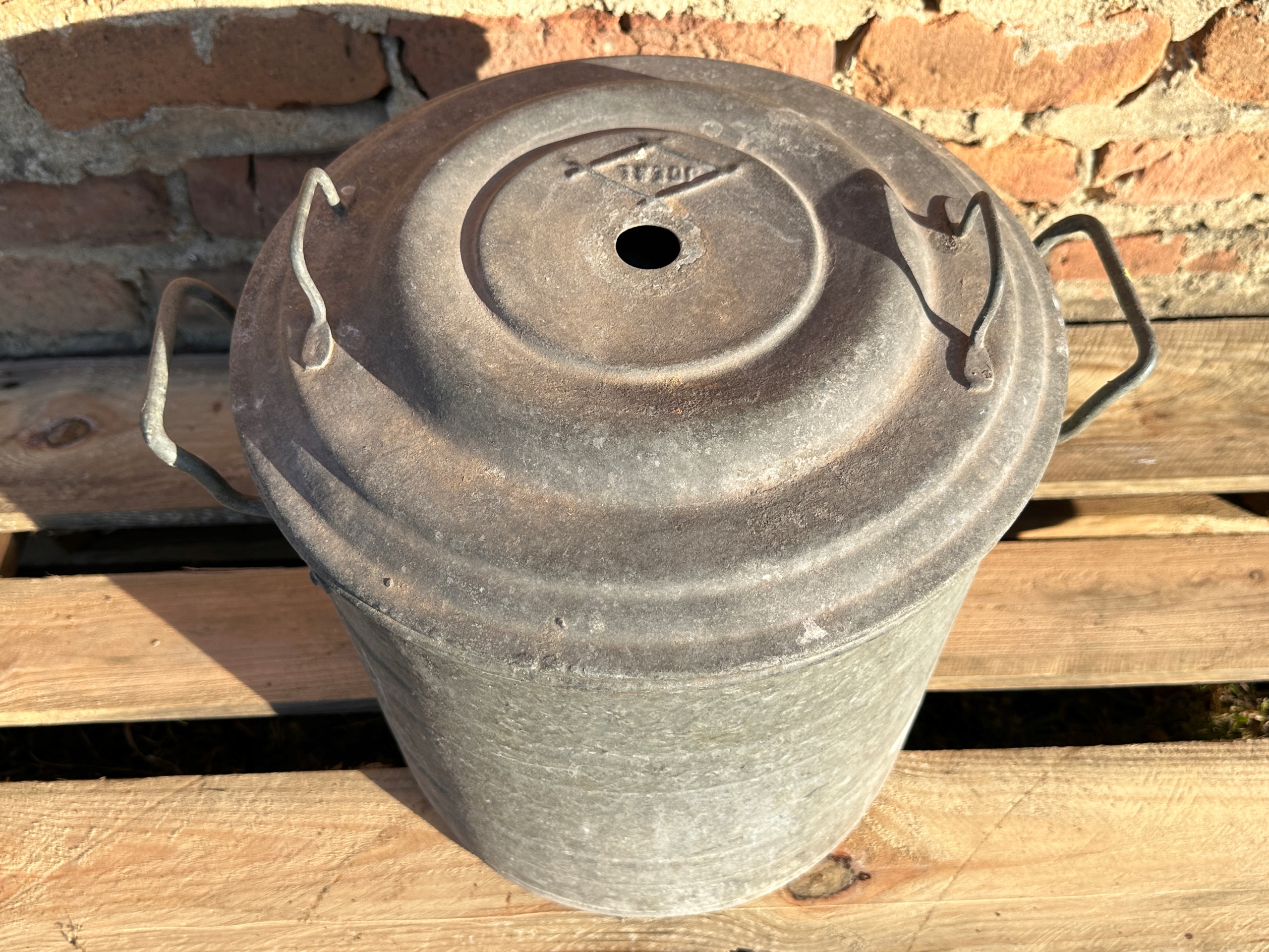 СТАРАЯ, ОРИГИНАЛЬНАЯ, ОЦИНКОВАННАЯ ЕМКОСТЬ ДЛЯ КОНСЕРВИРОВАНИЯ С ТЕРМОМЕТРОМ - ИДЕАЛЬНО