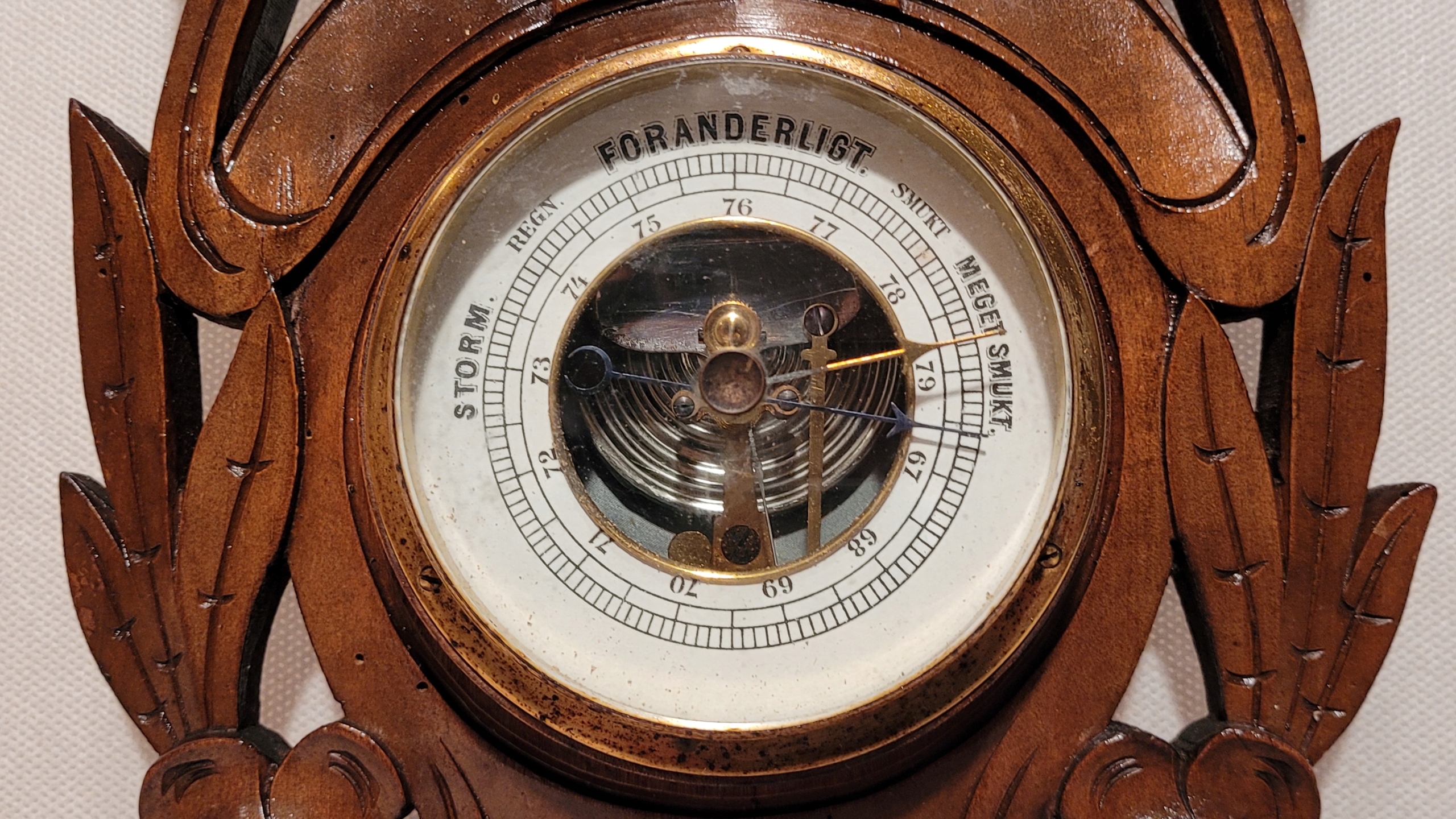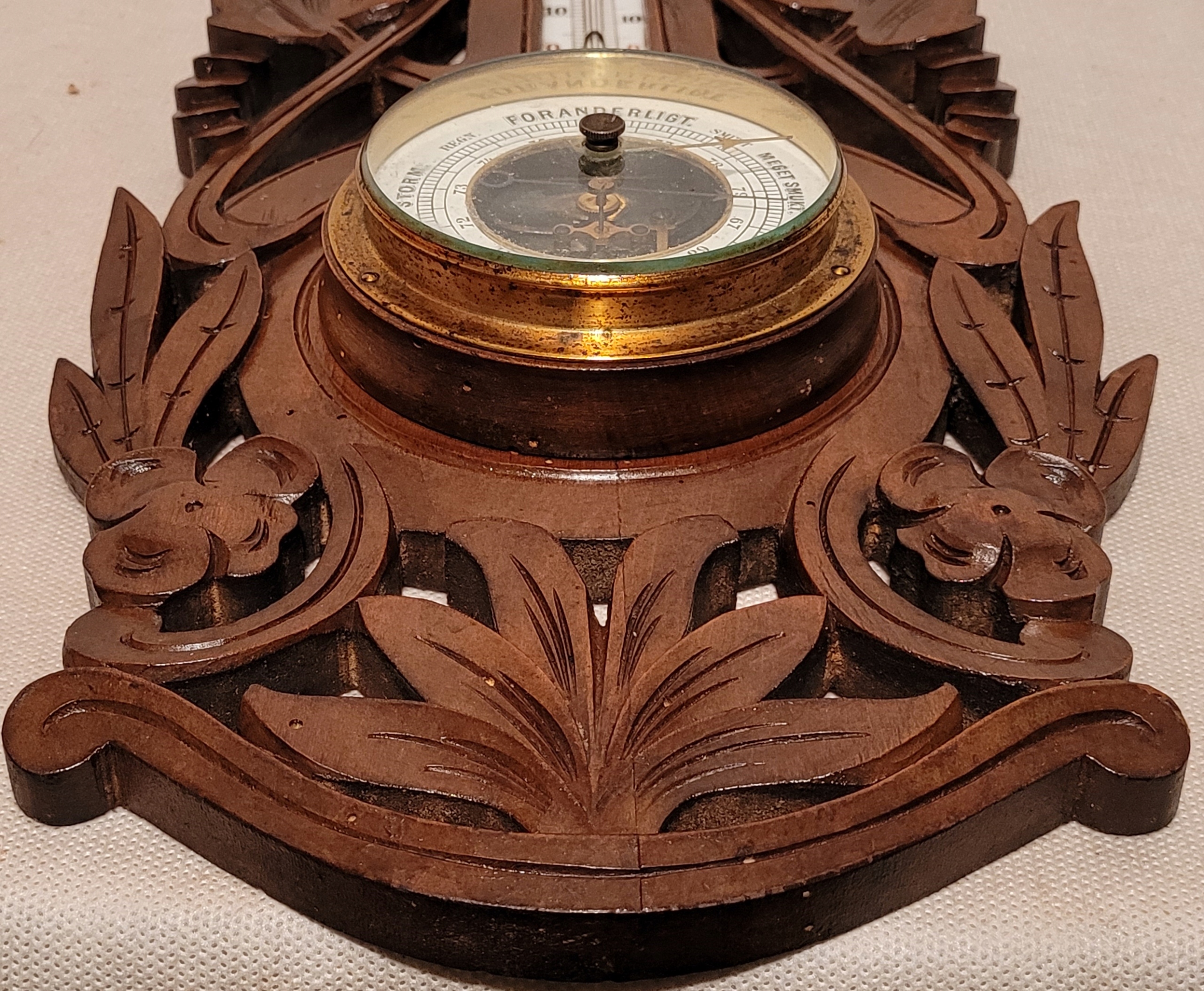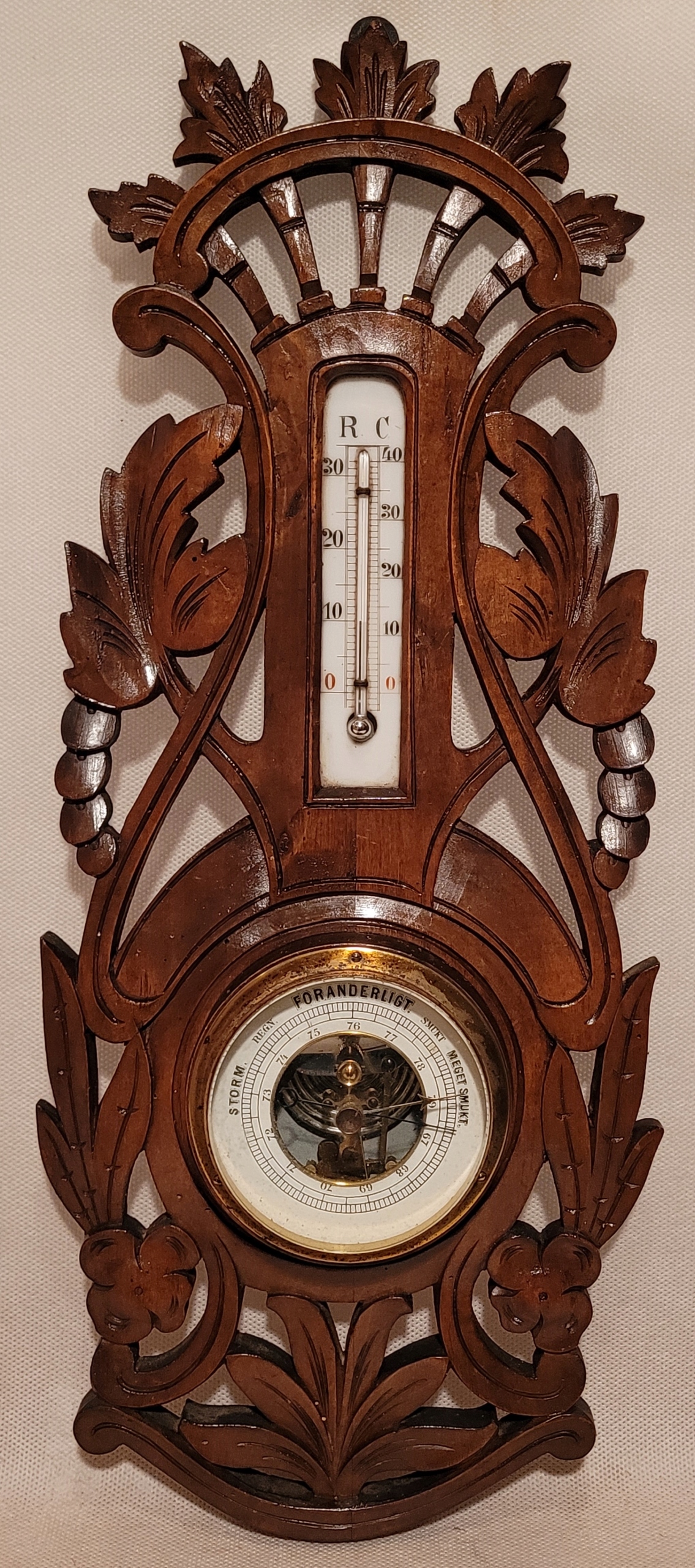 Старий барометр з термометром у дерев'яній рамці.