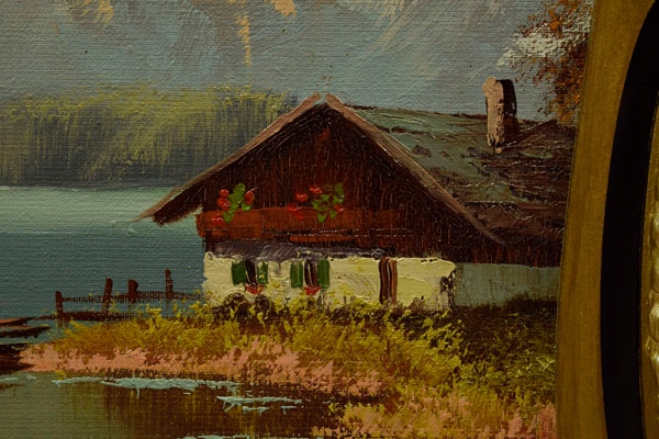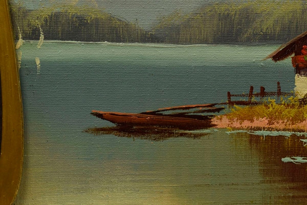 Старая живопись, альпийский ландшафт, нефть h1> Старое масло, окрашенное на холсте, придерживалось тарелки. Картина представляет альпийский пейзаж. На переднем плане стоит небольшой деревянный дом, расположенный рядом с берегом озера. На озере, недалеко от дома, вы можете увидеть одинокую лодку. На заднем плане есть красивые, высокие альпийские горы. Композиция вызывает чувство мира, тихой и близости с природой. h1> Изображение сформулировано в ручной раме, которая является бесплатным дополнением к изображению. h1> Состояние изображения видно на картинках ниже. неотъемлемая часть описания изображения.