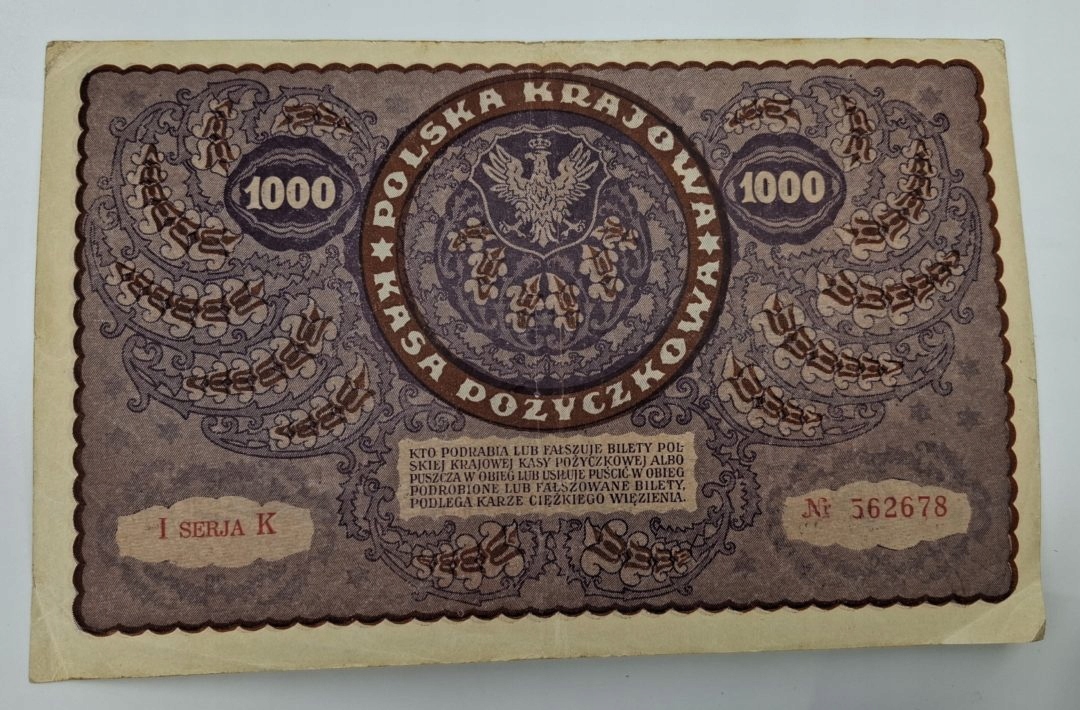 Старая коллекционная банкнота номиналом 1000 польских марок, Польша 1919 г.