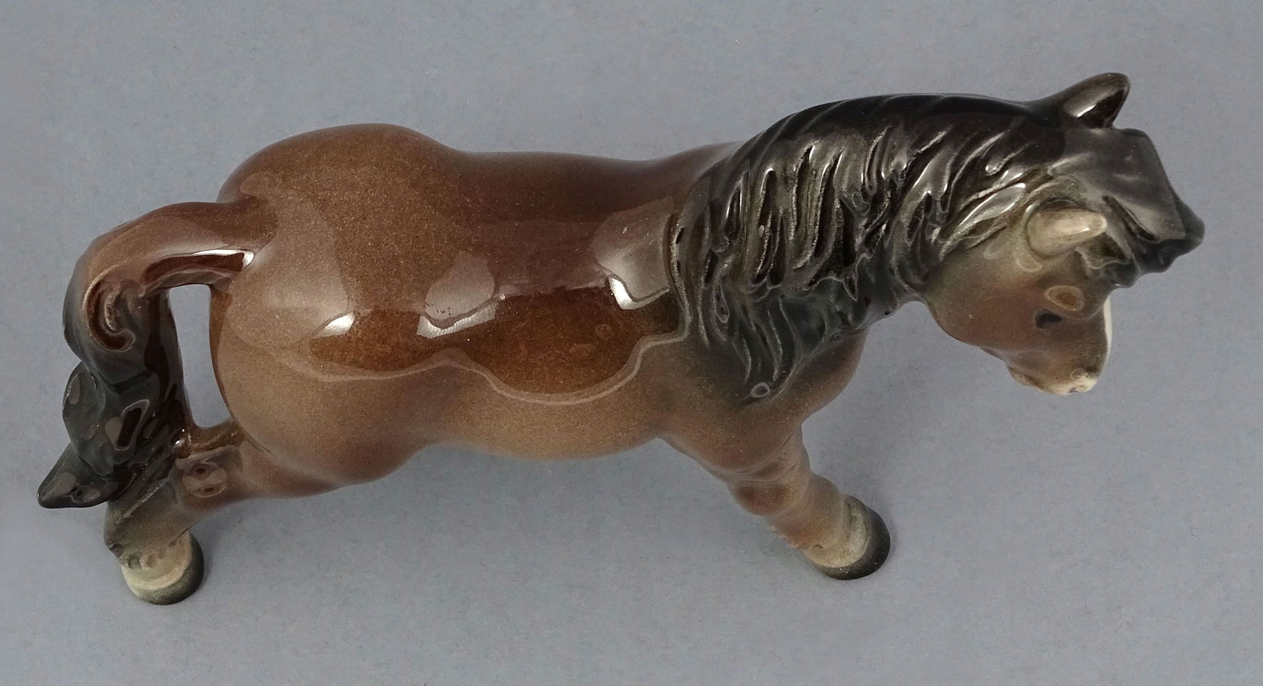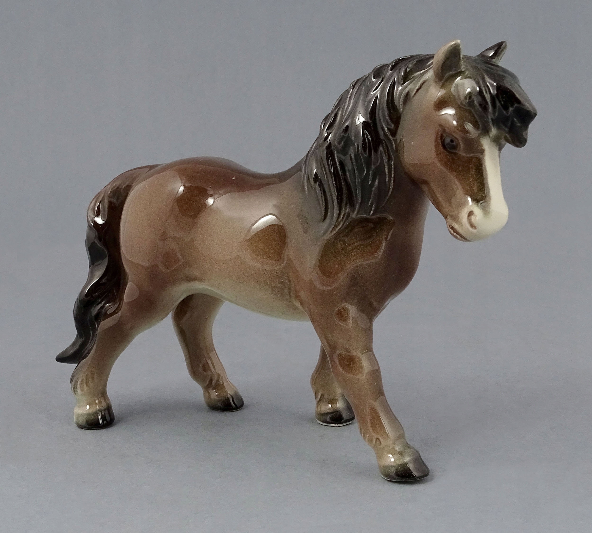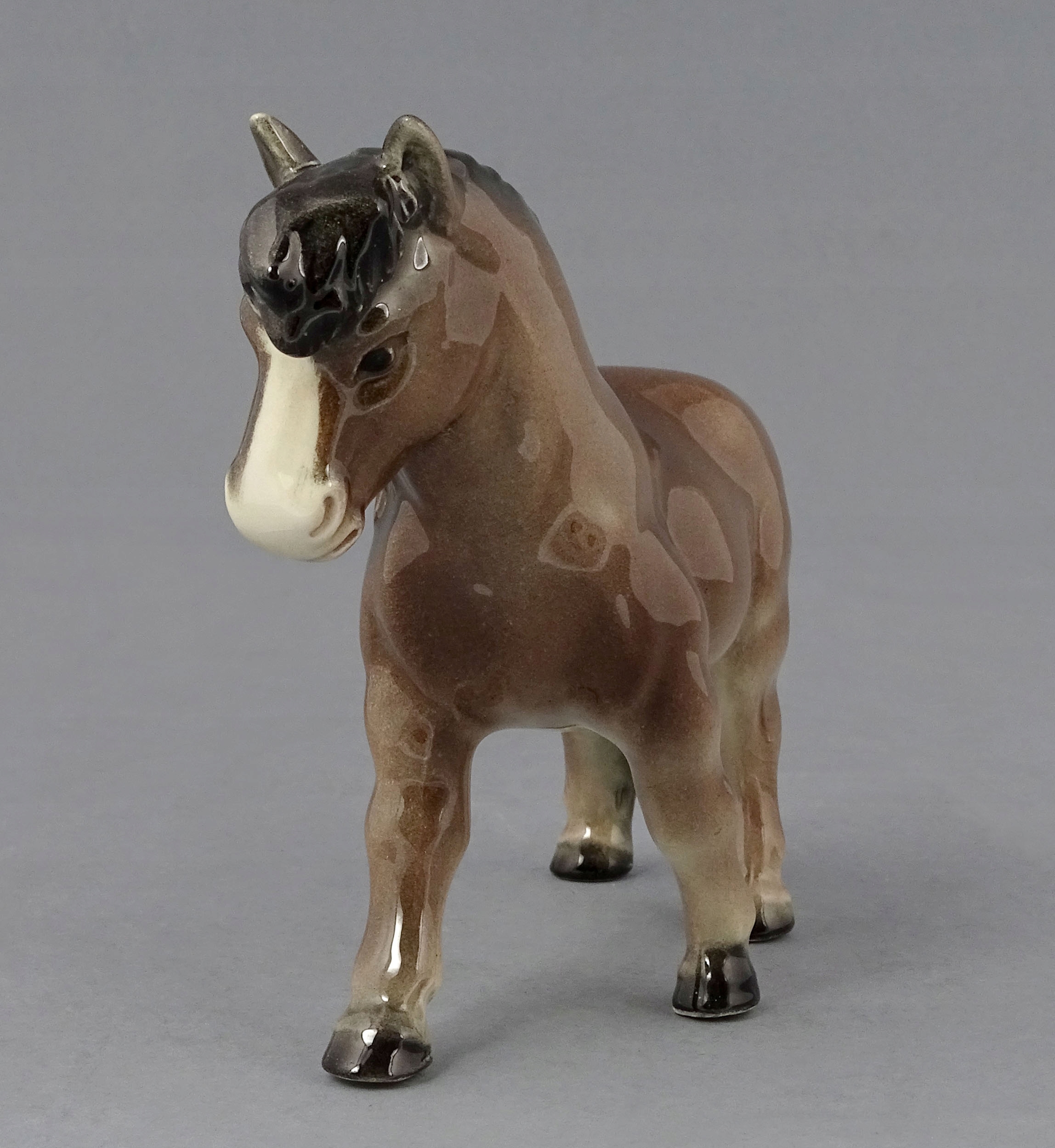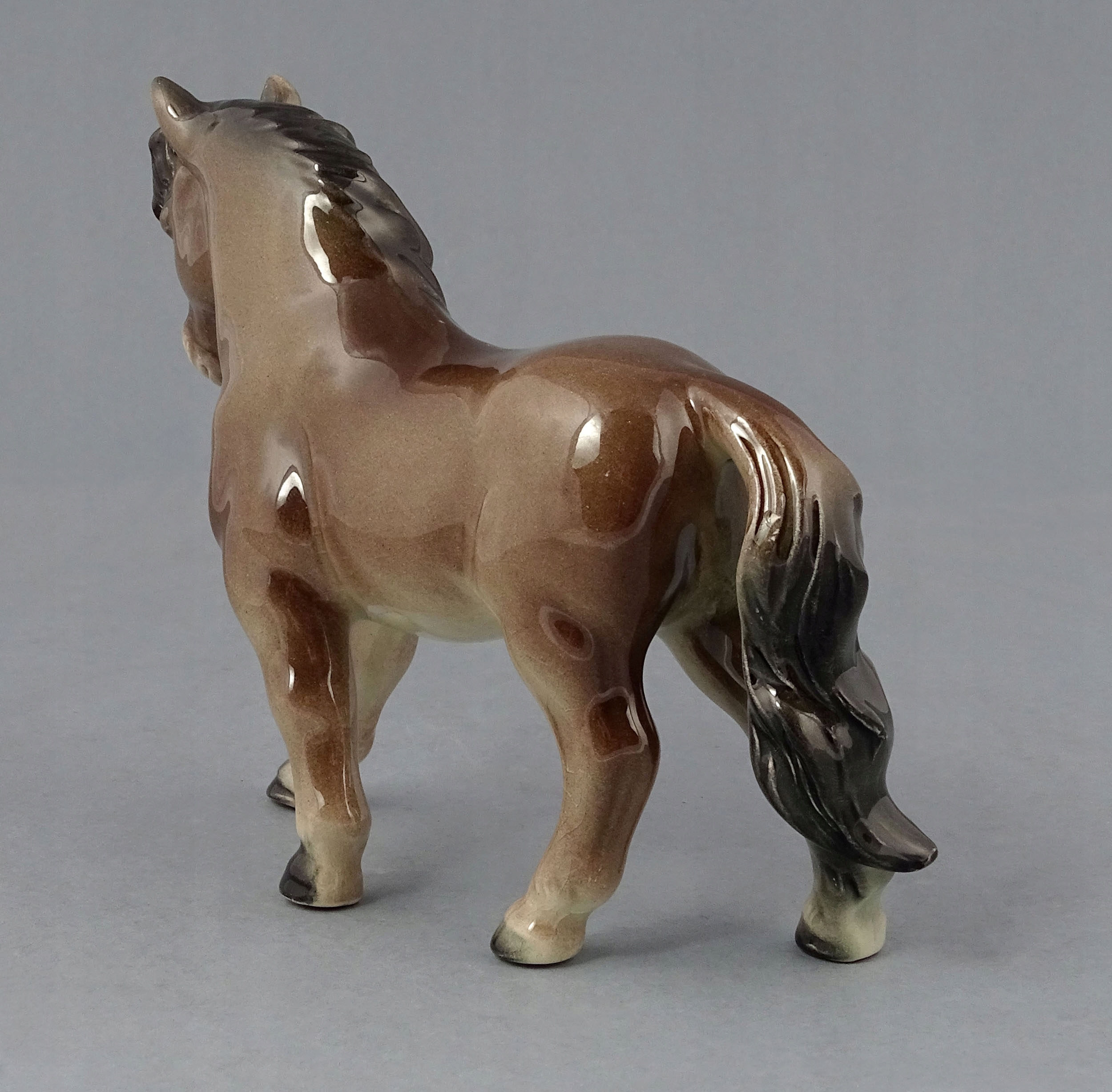 Фигурка небольшой лошади, с пышной гривой и длинным хвостом, со слегка наклоненной вперед головой, стоящей немного врозь на четыре ноги. Лошадь гнедой масти, с белым пятном на голове и возле копыт.