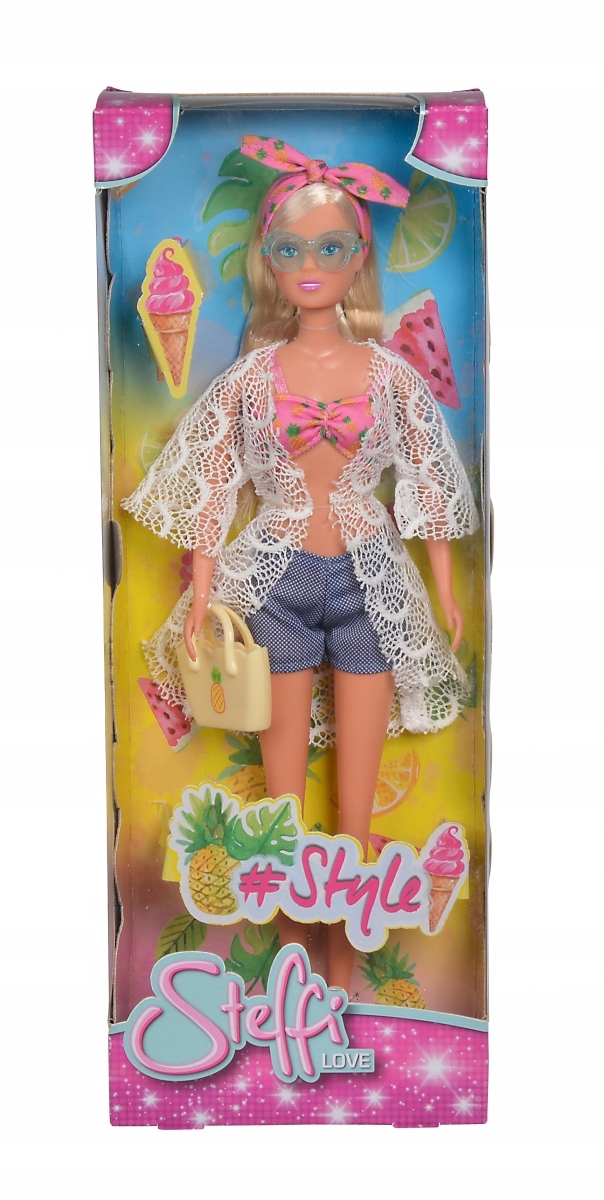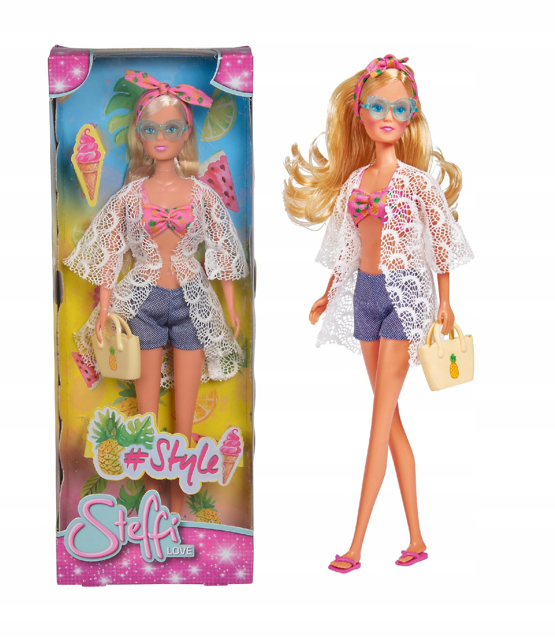 Кукла Штеффи в модном пляжном наряде, солнцезащитных очках и шлепанцах с белым чехлом.
