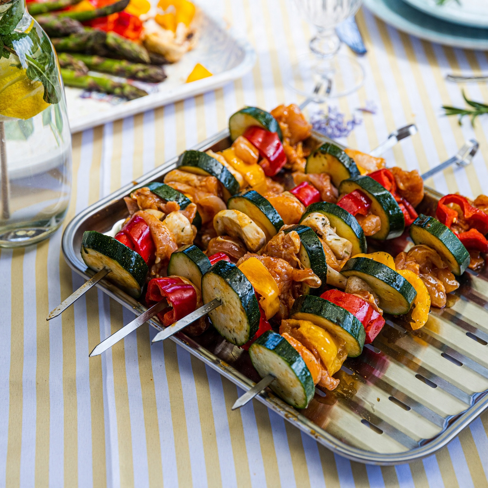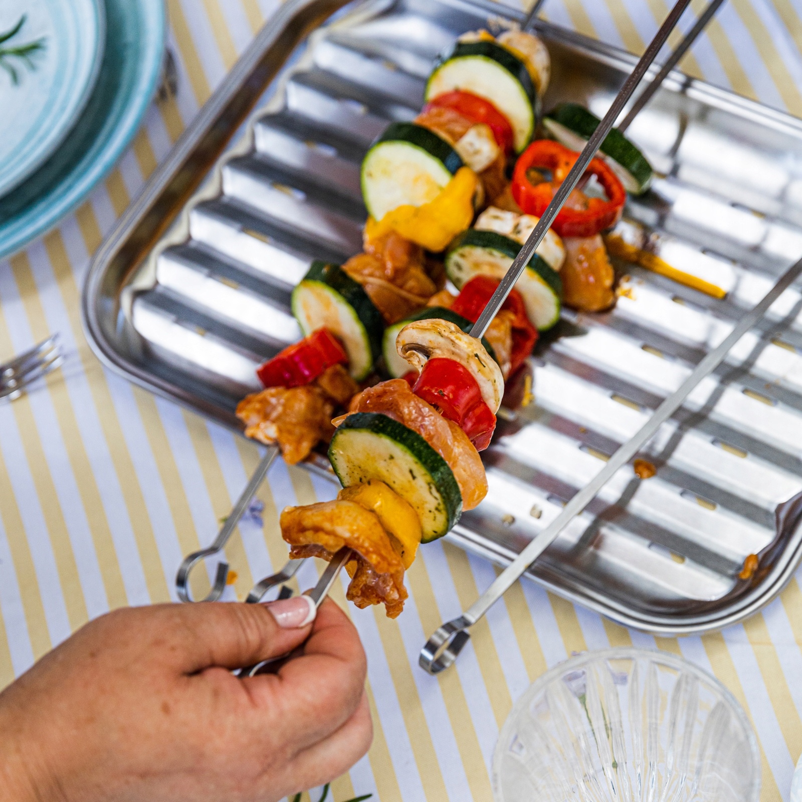 Приготовьте идеальный овощ, мясо или рыбные шашлыки благодаря твердому набору перекоса Kinghoff KH-1914 . Эти прочные и острые шашлыки, изготовленные из высококачественной нержавеющей стали.