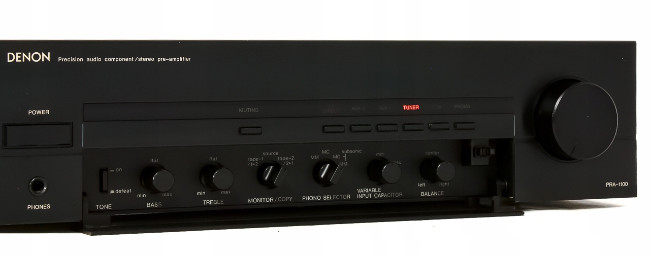 Denon PRA-1100 — один из самых совершенных и профессиональных предусилителей. Это специализированный предусилитель для усилителей мощности Denon диапазонов от POA-1100, 2200, 4400 до 6600. Как в системах с одним усилителем, так и с двумя - двойное моно. Имеет два выхода для двух усилителей мощности. Это тяжелое устройство, созданное до краев без каких-либо компромиссов. Качество компонентов действительно впечатляет. Что сразу бросается в глаза, так это очень обширная секция фонокорректора. Предлагает использование картриджей ММ и МС, имеет инфразвуковой фильтр для обоих картриджей, а также дополнительно имеет регулируемый диапазон номинала используемого картриджа от 200 до 600пФ! Абсолютный хит для людей, использующих проигрыватели, нет необходимости приобретать отдельный PRE. Еще одна интересная особенность этого предусилителя — регулирование входного сигнала на предусилитель для наушников! Это сводит искажения в наушниках практически к нулю. Более того, он имеет все остальные стандартные функции, а также прямой ввод CD-сигнала, полностью минуя тракт тональной коррекции. Все работает плавно и бесшумно. Из-за частых вопросов о том, для чего используется переменный входной конденсатор: В традиционном усилителе входная мощность Phono постоянна, что приводит к частому несоответствию качества звука в зависимости от используемого картриджа. Это особенно заметно при использовании картриджей ММ, где высокая индуктивность катушки вызывает колебания качества звука для обычной системы с фиксированной входной емкостью. В этом случае компания Denon разработала ручку переменной входной емкости, которую можно установить в любом диапазоне от мин до максимума, чтобы выбрать оптимальное значение емкости для конкретного картриджа. Основываясь на этой уникальной концепции, система Denon обеспечивает более точную настройку для воспроизведения звука неизменно высокого качества.