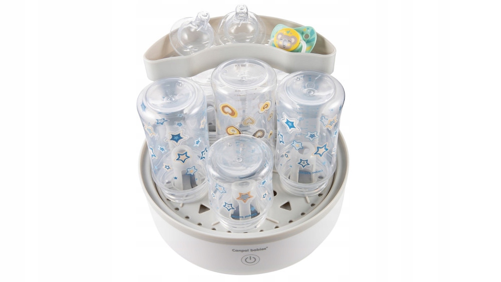 Электрический паровой стерилизатор CANPOL BABIES 77/052 позволяет быстро и удобно дезинфицировать аксессуары для детского питания и ухода за детьми. Одновременно в нем можно разместить 5-6 бутылочек и другие мелкие аксессуары. Дезинфекция занимает до 8 минут, при этом на весь процесс расходуется всего 75 мл воды. Стерилизатор прост и интуитивно понятен в использовании, управляется одной кнопкой. Он безопасен и автоматически отключается после дезинфекции. Он имеет специально разработанный фильтрующий контейнер, который облегчает удаление воды и примесей после процесса дезинфекции. Не требует использования дополнительных химикатов.