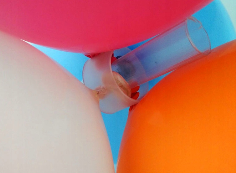 Прикрепите воздушные шары к зажиму, а затем наденьте их на прозрачную трубку.