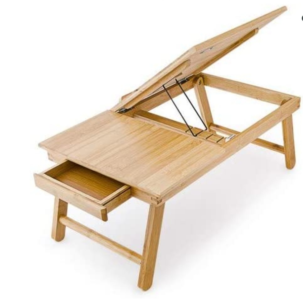 Таблица ноутбуков составляет около 55 x 33 x 24 см с бамбуком. Часть полки регулируется. Благодаря этому их можно наклонить и настроить ноутбук, чтобы хорошо работать. С правой стороны есть выдвижной отсек, в котором вы можете хранить аксессуары, такие как ручки, заметки и т. Д. Затем просто закройте раздвижную камеру, и мелочь исчезнет.