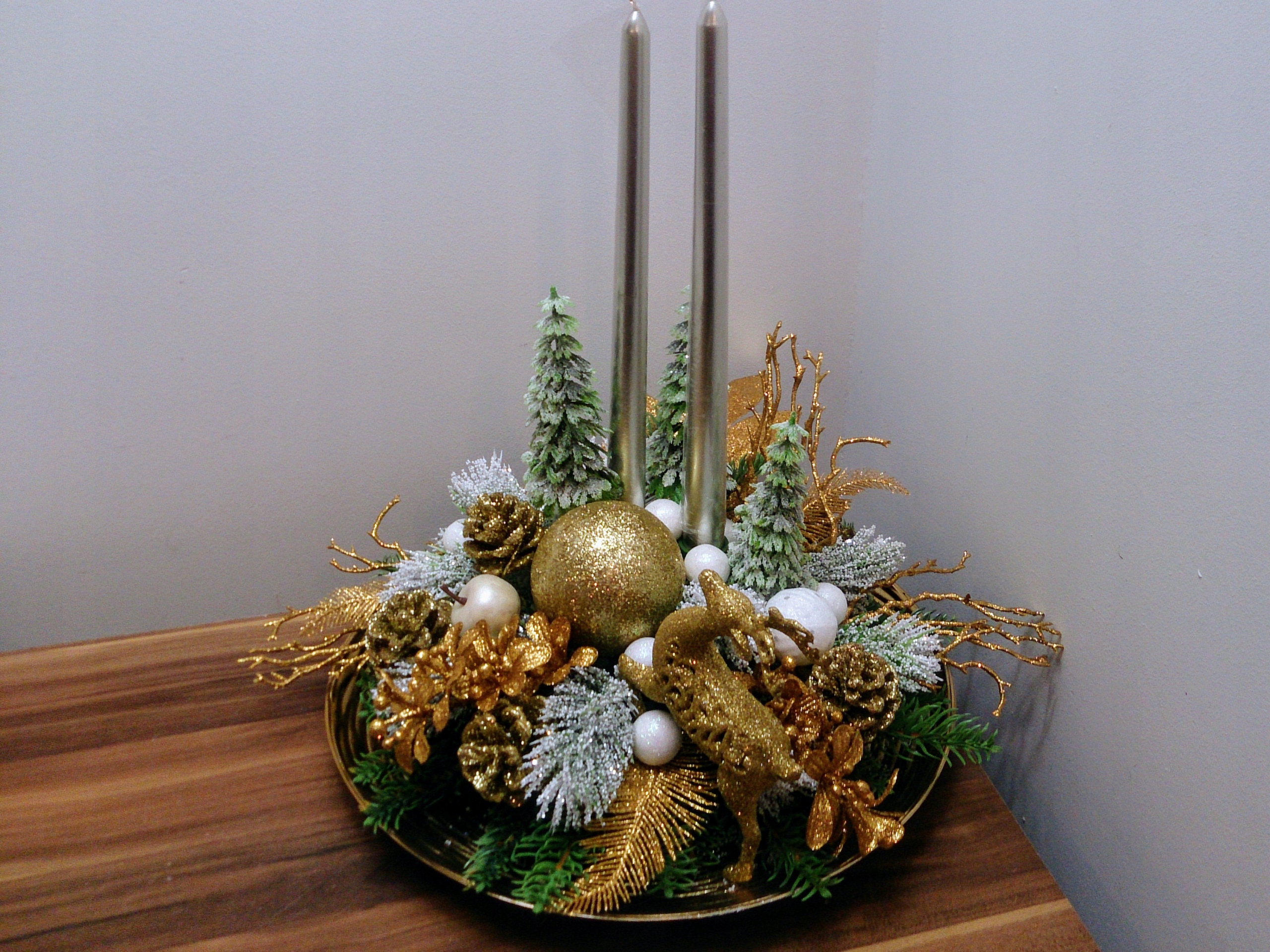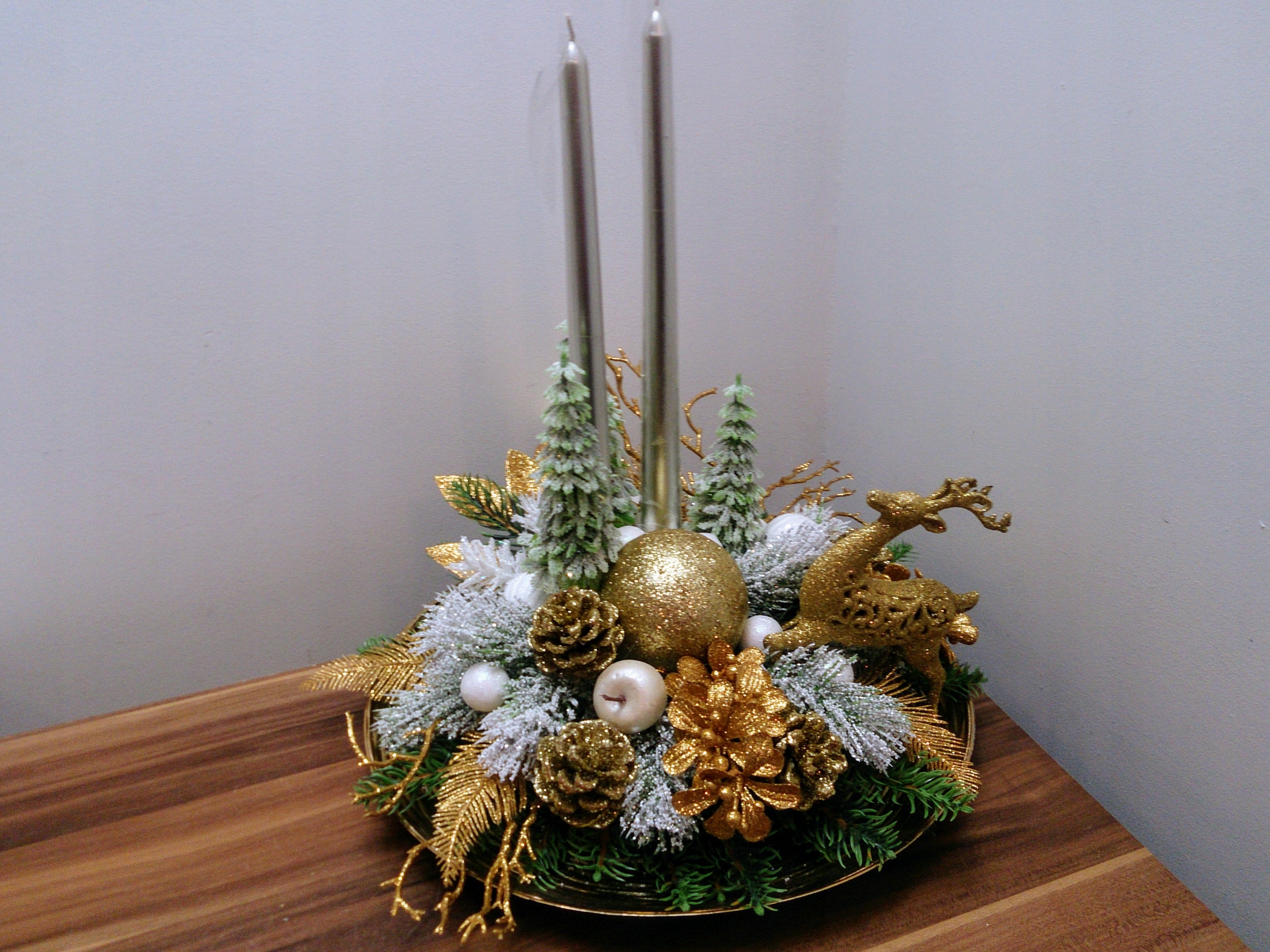 Основой композиции является большой, элегантный поднос в золоте. Композиция станет красивым украшением стола в канун Рождества.