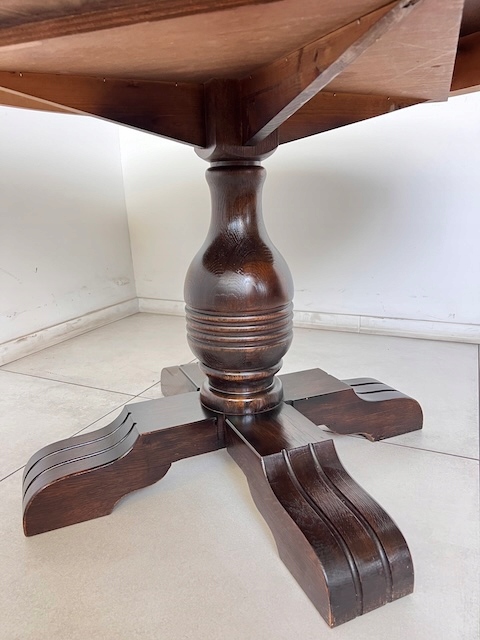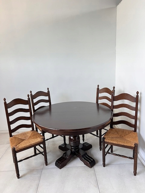 Круглый стол со стульями. Очень хороший набор. Круглый стол раздвигается и имеет четыре стула. Сиденья тканые. Набор сделан добротно. Его состояние подробно показано на фотографиях. Красивый комплект готов к установке.