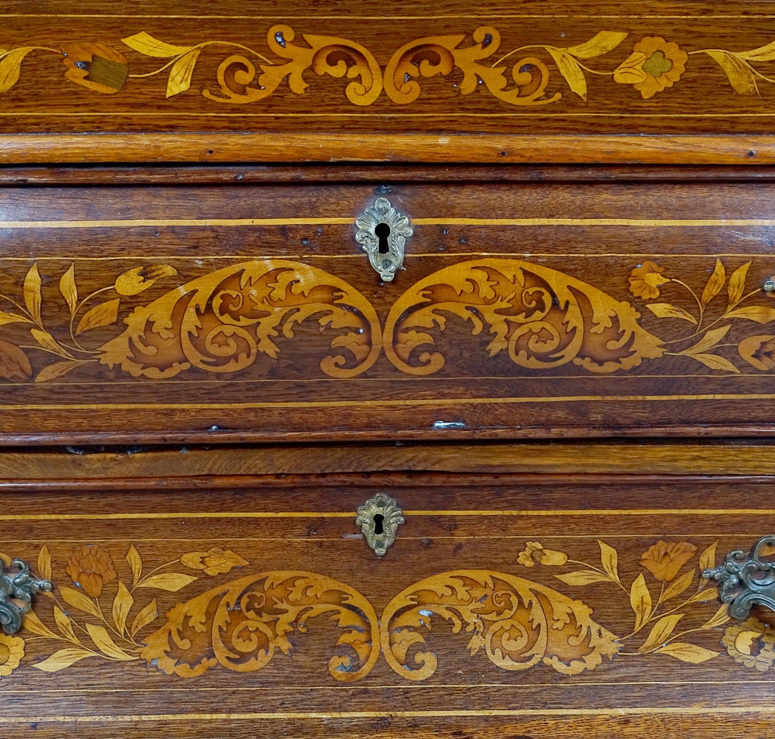 с выпуклым спереди корпусом и загнутыми передними боковыми краями. Ножки в виде львиных лап, слегка наклоненные наружу, прямые сзади, составляющие продолжение мебельной конструкции. Спереди три ящика: верхний и нижний с выпуклой поверхностью, средний с вогнутой. Все с парой прорисованных плашек по бокам, посередине ключа. Сверху он закрывается простой пластиной, которая в открытом состоянии опирается на две выдвижные скобы с расположенными по бокам латунными ручками. Внутри находится открытая двойная скиния с десятью ящиками, разделенными вертикальными досками, каждый с медными ящиками. Посередине, за дверцей, еще три небольших ящика и выдвижной отсек для хранения посередине. Мебель инкрустирована по всей поверхности растительными мотивами – вазами с цветочными композициями, птицами и цветочными букетами. По бокам секретера накладки дополнительно обрамлены двойными окантовками, как и на ящиках. На ящиках и навесной створке применены стальные замки.