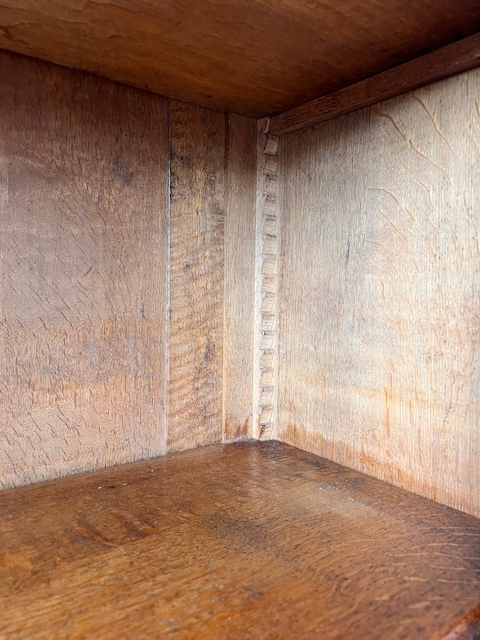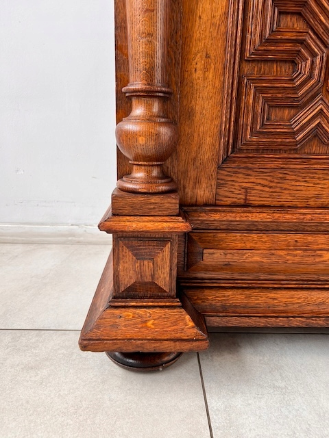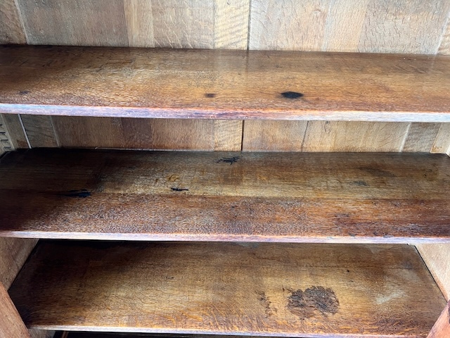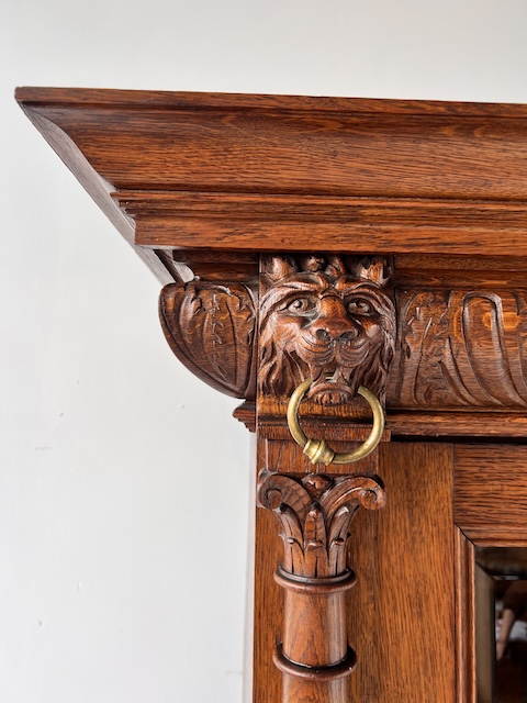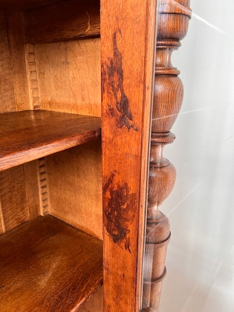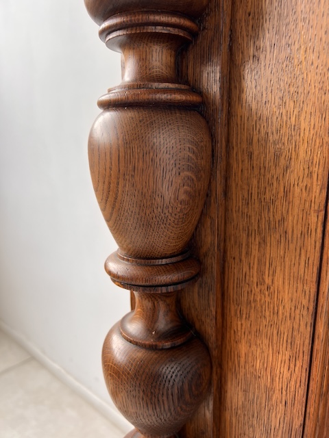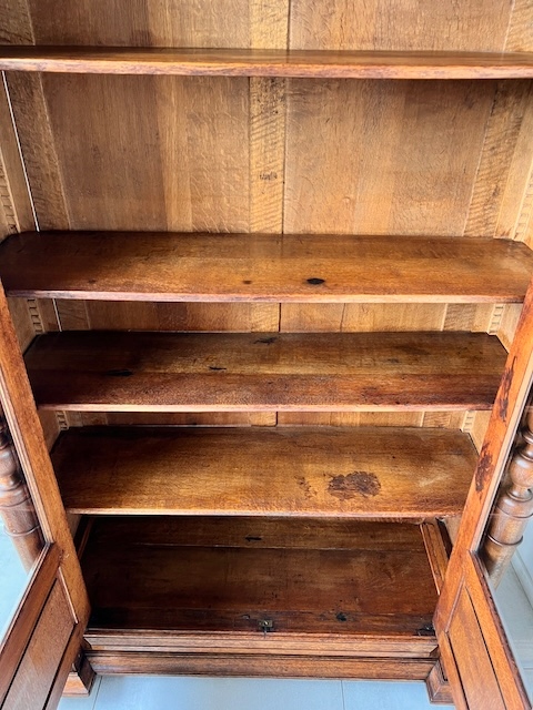 Стильная библиотека. Гламурный; богато украшен. Он изготовлен из древесины дуба. По нашим оценкам, ему может быть около ста лет. Он сохранился в хорошем состоянии. Повреждений и дефектов нет. Имеет типичные следы использования. Стекло двери оригинальное, скошенное. Замок функциональный, в комплекте есть ключ. Внутри 5 полок. Их высоту можно свободно регулировать. Полки изготовлены из массива дерева и, несмотря на большие нагрузки, не деформируются. На них имеются небольшие изменения цвета. Библиотека красивая. Он сразу станет украшением комнаты, в которой его поставят. Он разобран и доставлен новому владельцу в разобранном виде. Он готов к вставке.