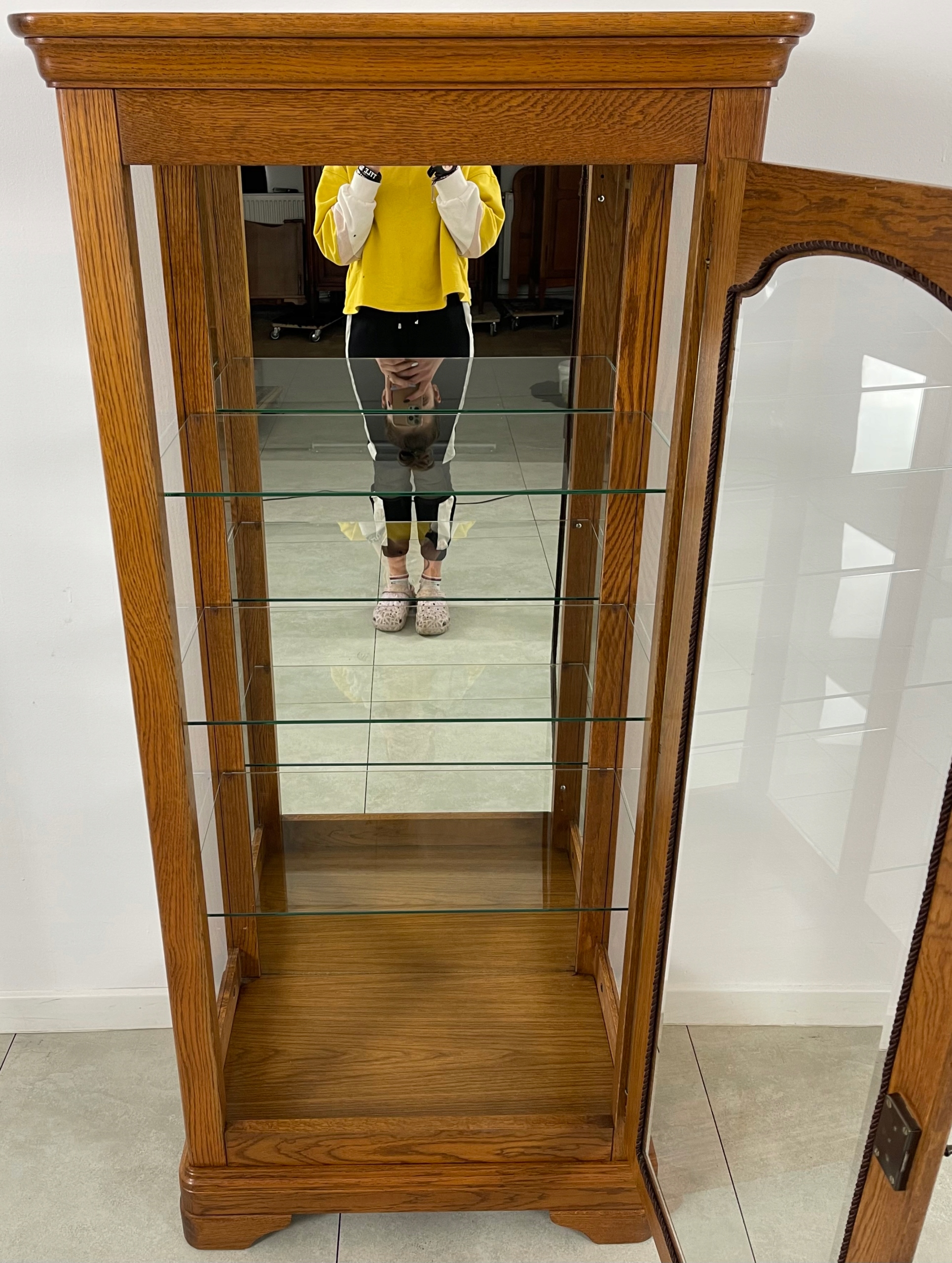 Витрина застеклена с трех сторон. Сзади имеется зеркало.