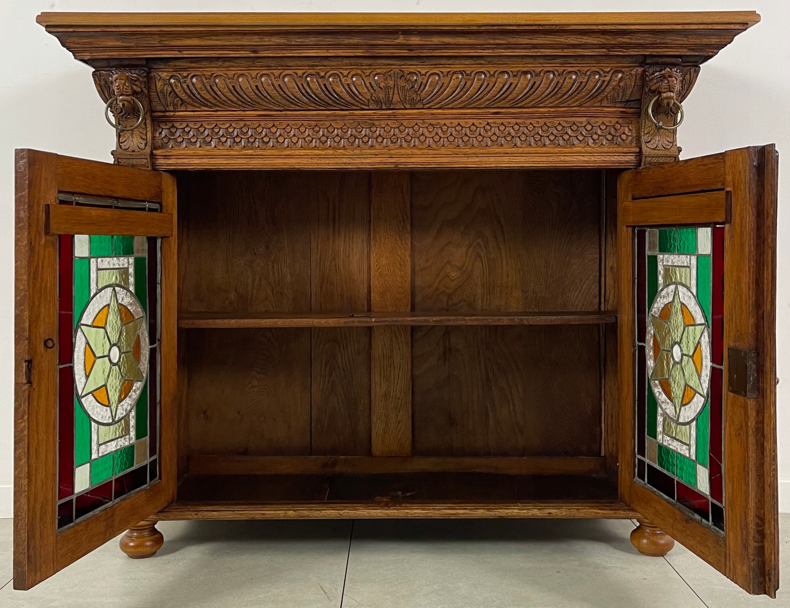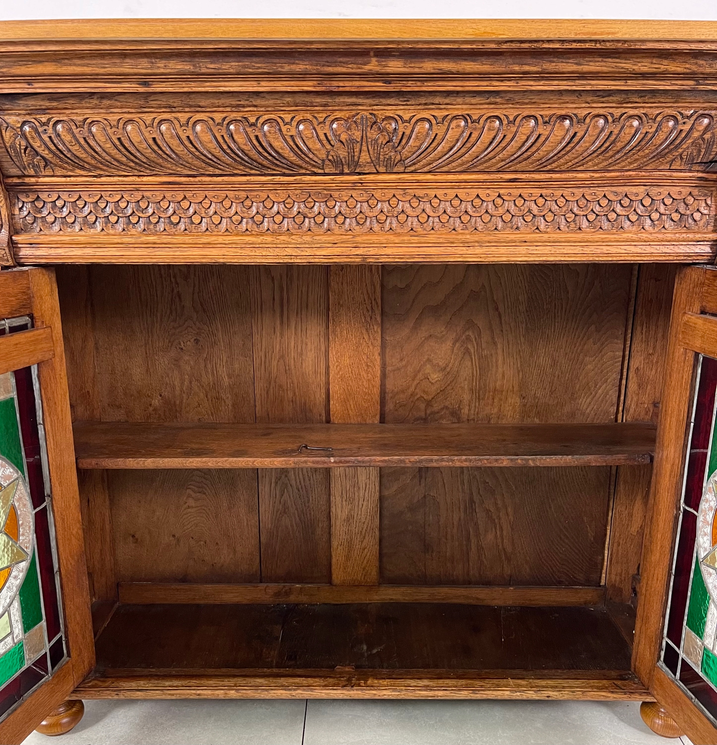 Комод имеет две навесные стеклянные фасады. Разноцветное стекло создает красивые витражи, которые декоративно украшают все помещение.