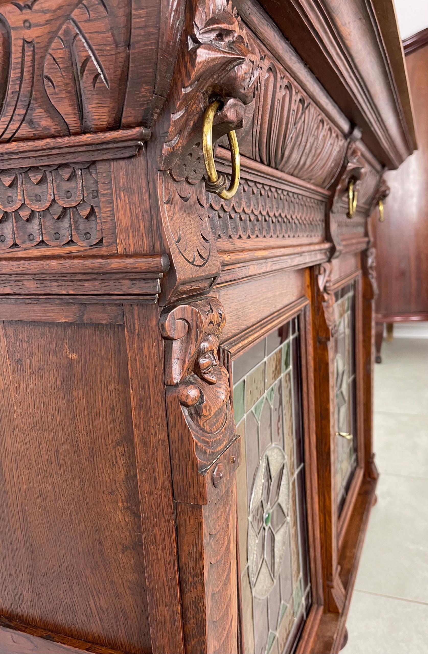 Комод украшен многочисленной резьбой. Имеет два навесных фасада, декорированных цветным стеклом, внутри полка. В одном месте на стекле есть крошечная трещина, видно на последнем фото.