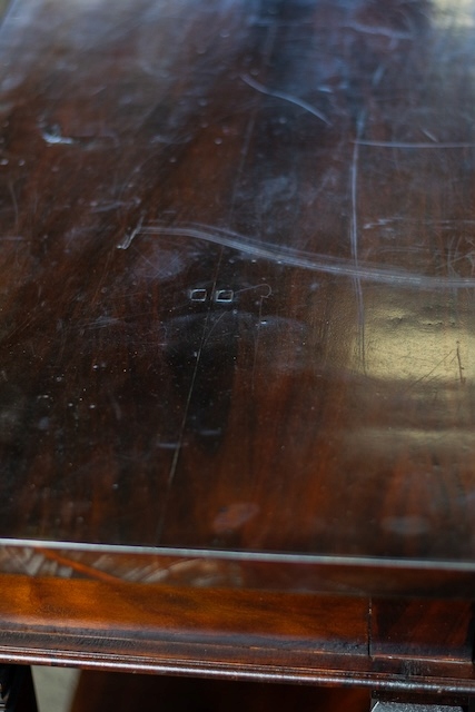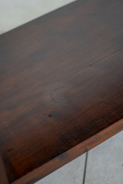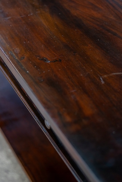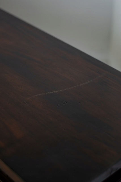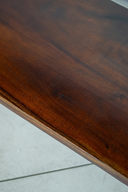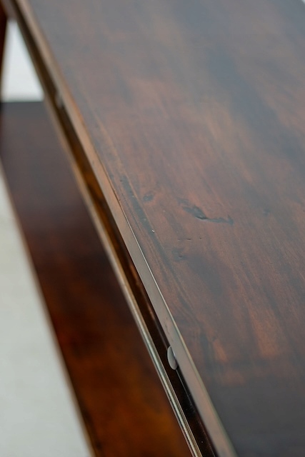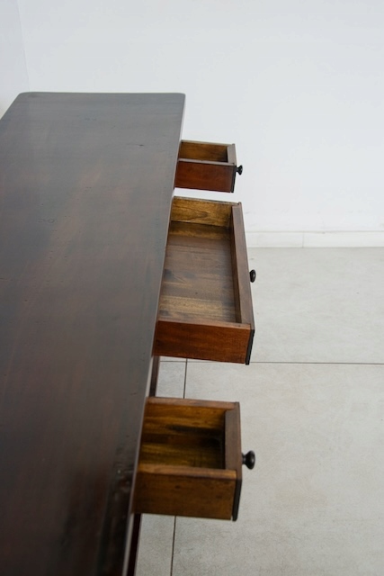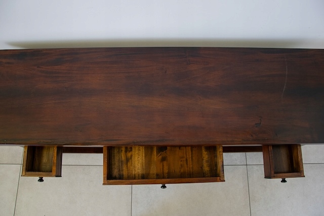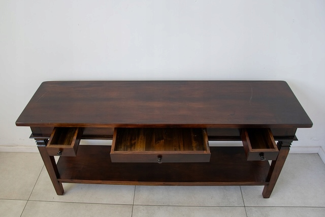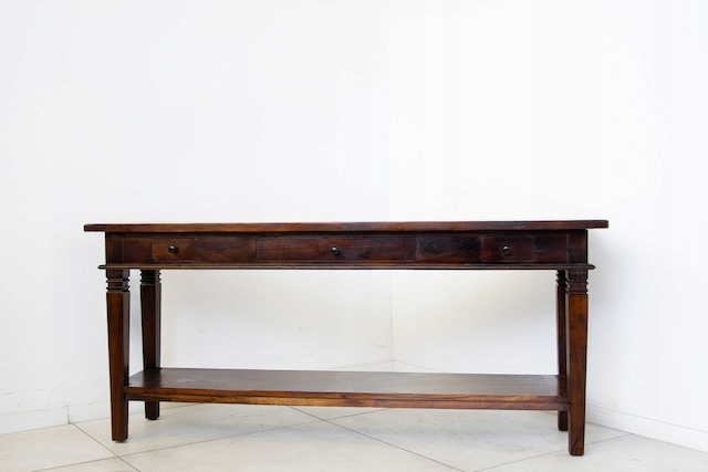 Стильная консоль из экзотического дерева. Очень хорошенькая. Под столешницей расположены три практичных ящика и полка внизу. В целом он в хорошем состоянии. Единственный его недостаток – поцарапанный верх. Других повреждений и дефектов нет. Внутри ящики чистые. Консоль готова к вставке.