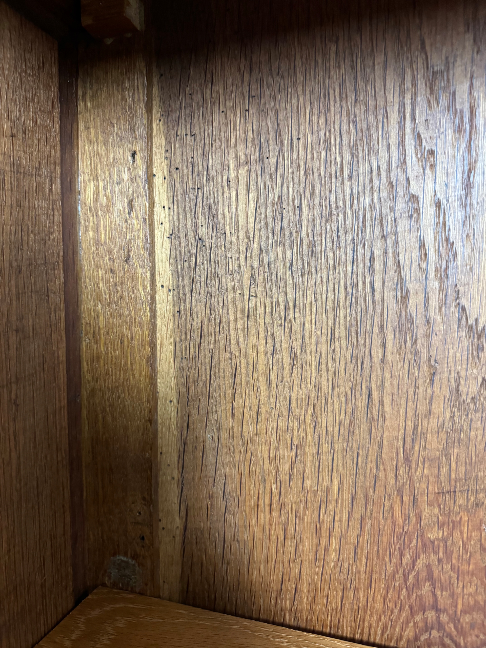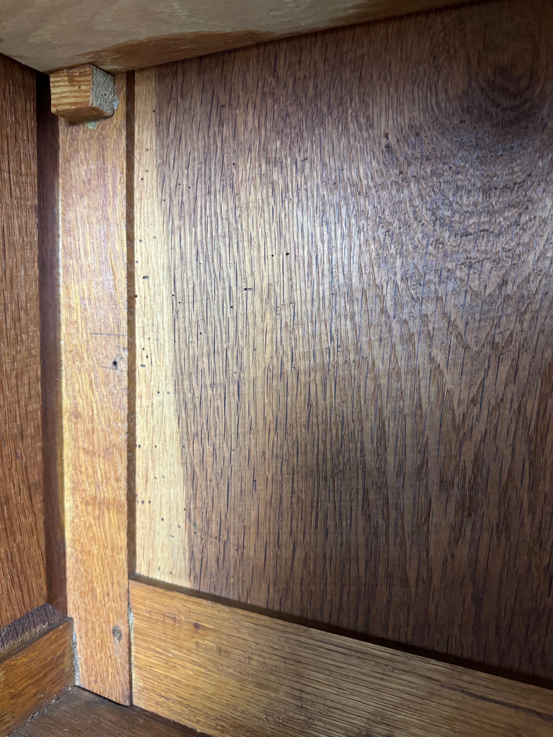 Внутри мебели расположены три массивные, регулируемые по высоте дубовые полки. Внутри ухоженный и чистый.