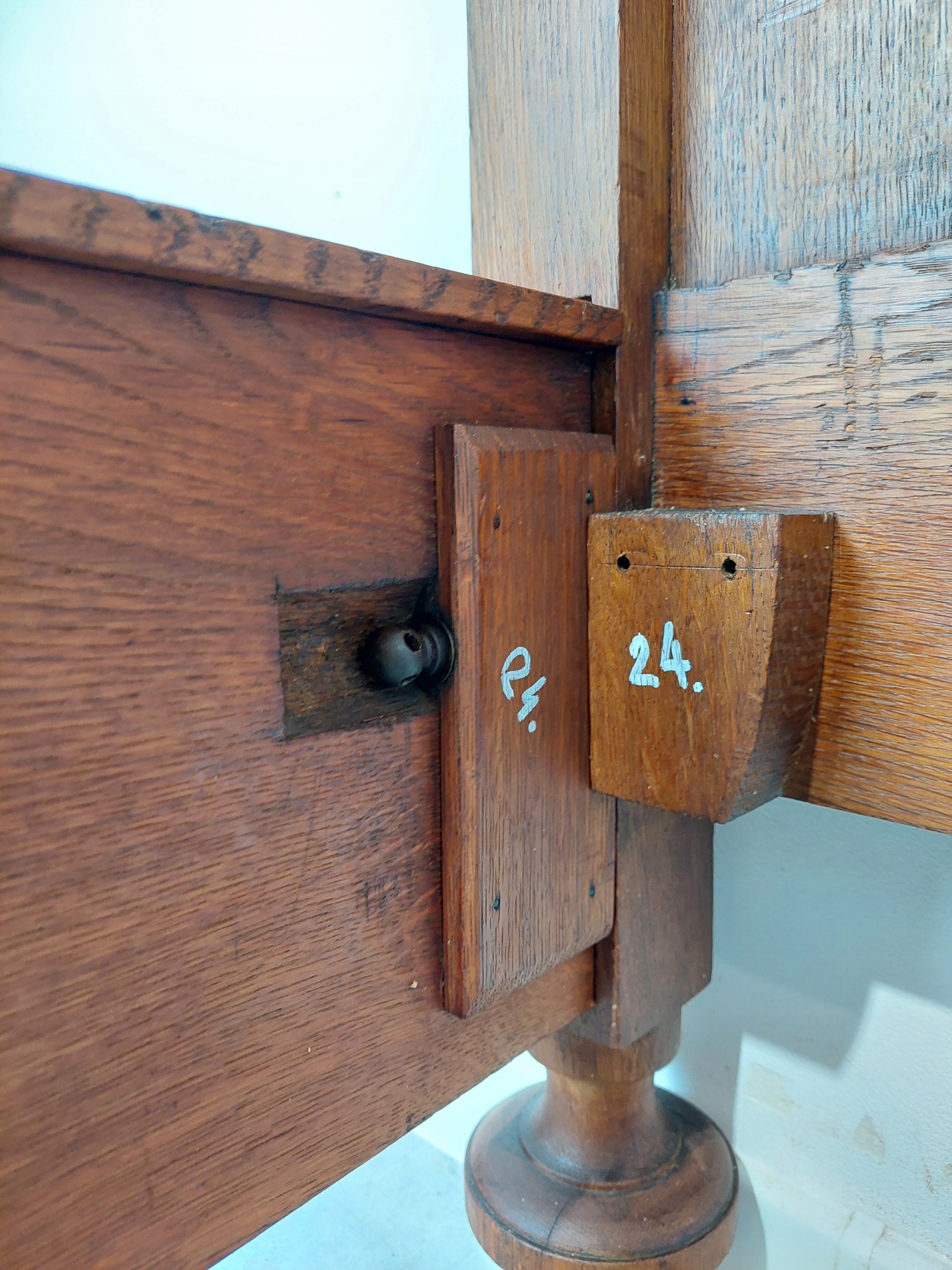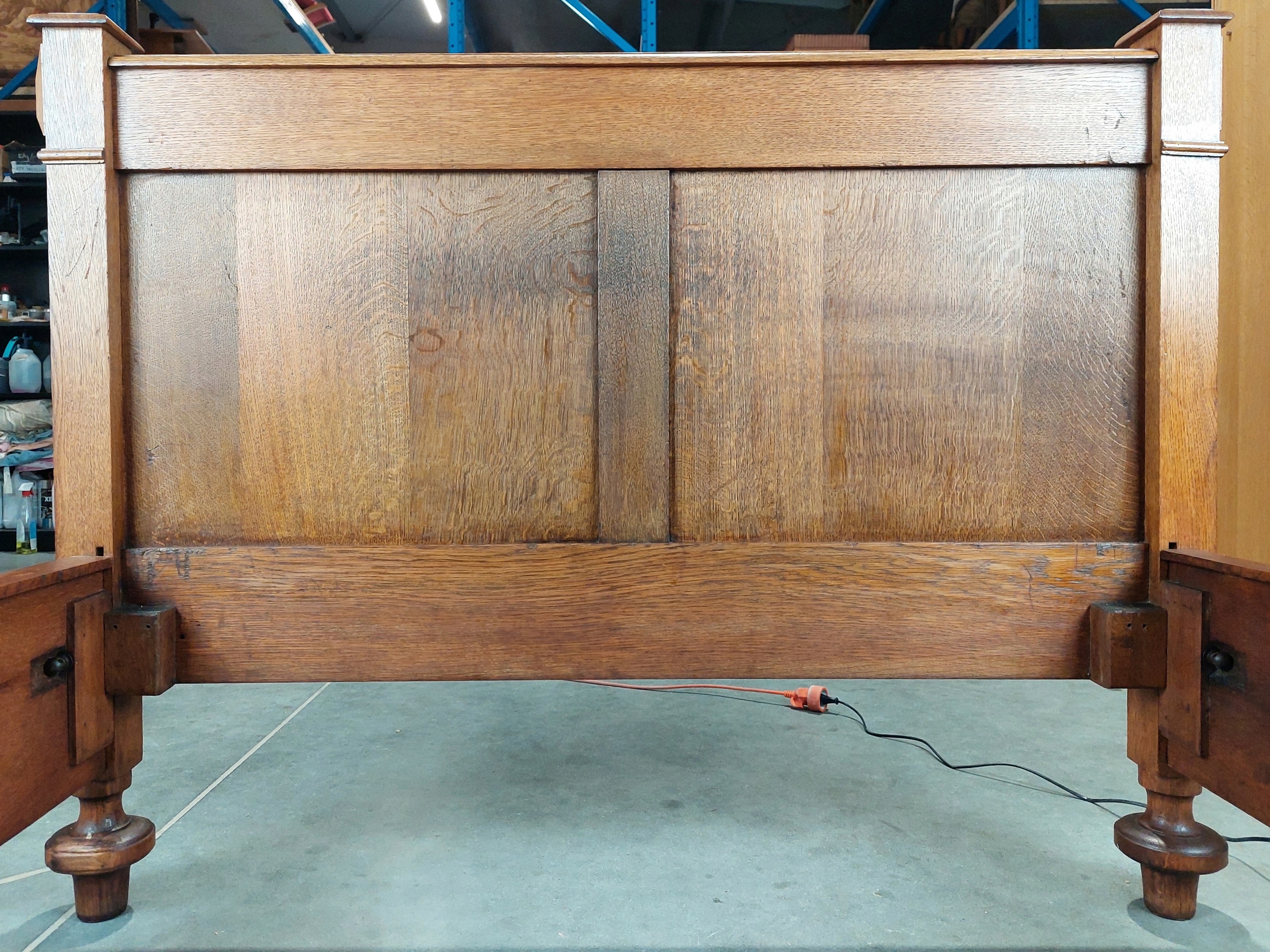 Стильная эклектичная дубовая кровать, привезенная из Франции. Сплошная конструкция, полностью изготовленная из твердого дуба. Декор над изголовью можно удалить, он показывает следы ремонта. Есть незначительные коммерческие оценки. Расчетное время восстания - поворот 1920/1930. Отверстие составляет 116 см)