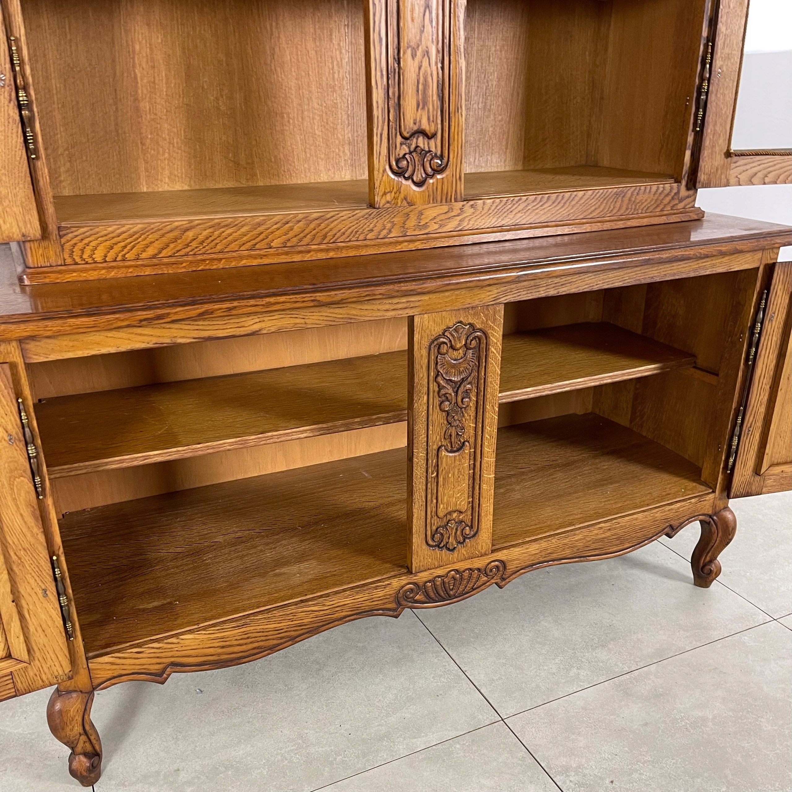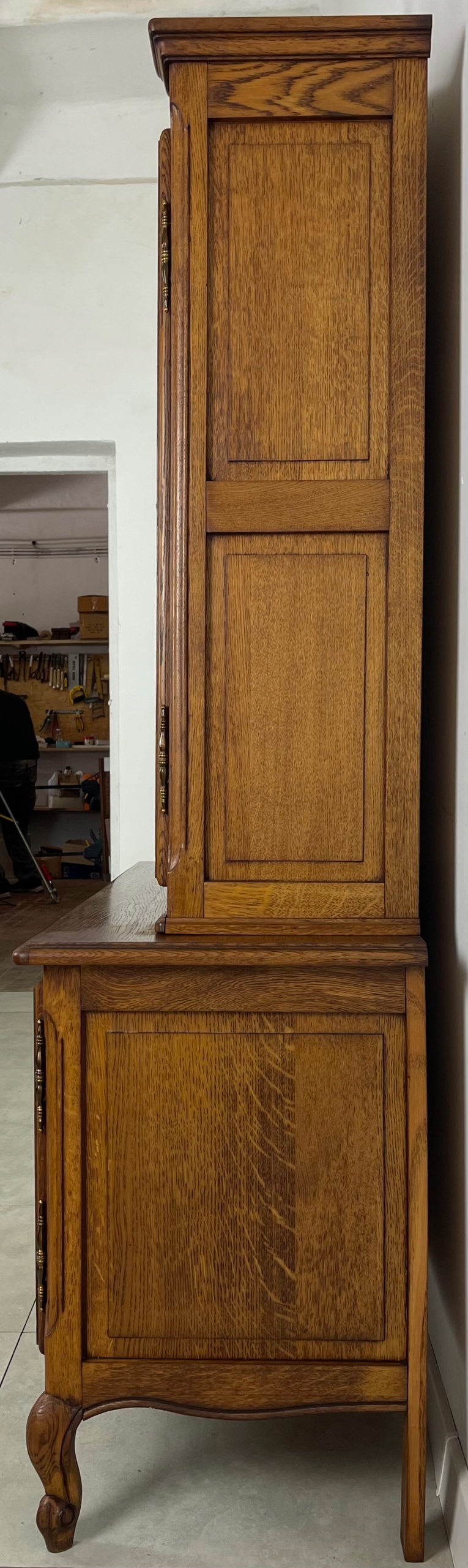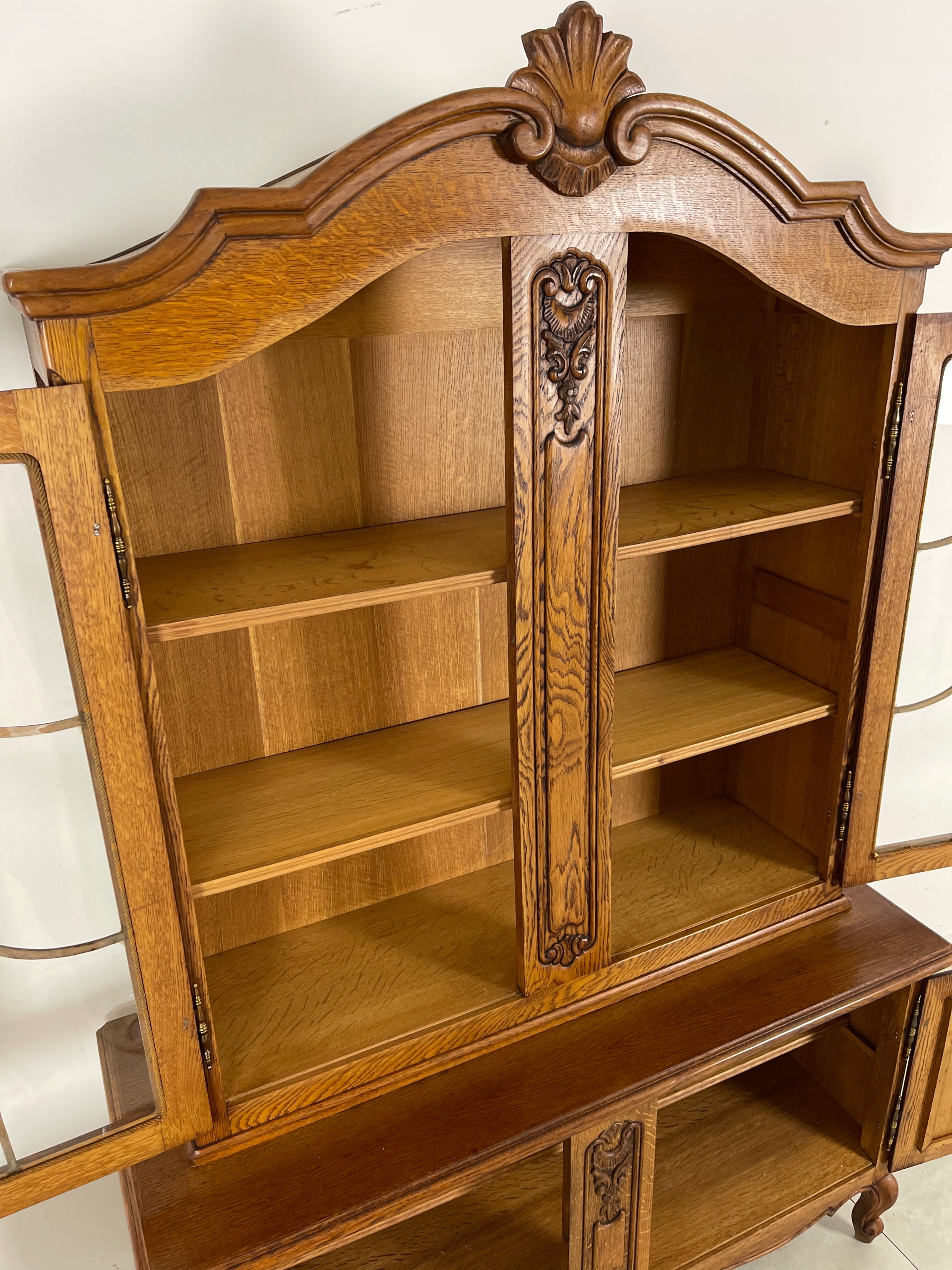 Витрина украшена красивой резьбой и латунной фурнитурой. Стоит на ножках кабриолета.