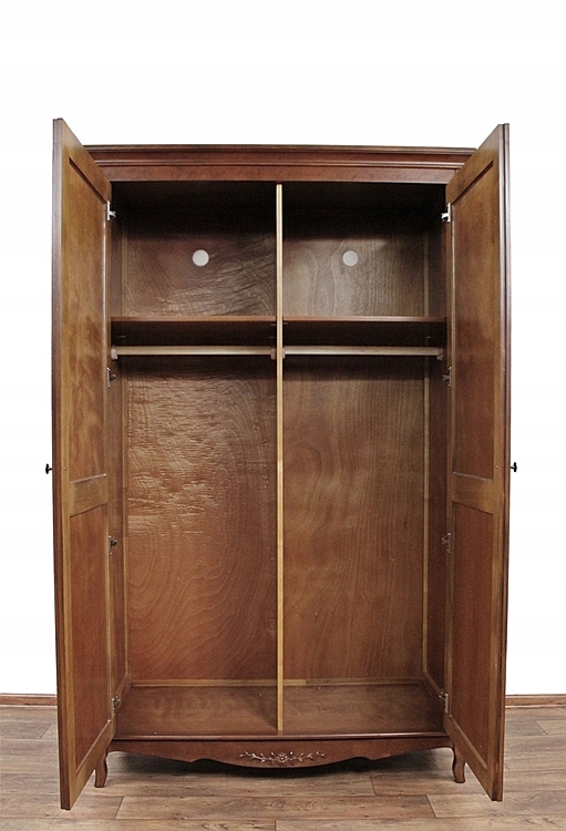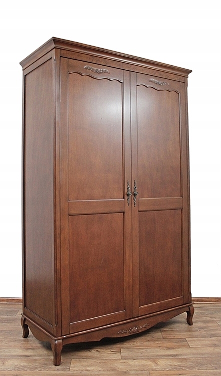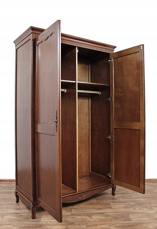 Элегантный деревянный предмет мебели с гнутыми ножками и нежной красивой резьбой. Внутри имеется штанга для подвешивания одежды и две полки. Изготовлен с большой тщательностью и особым вниманием к каждой детали.