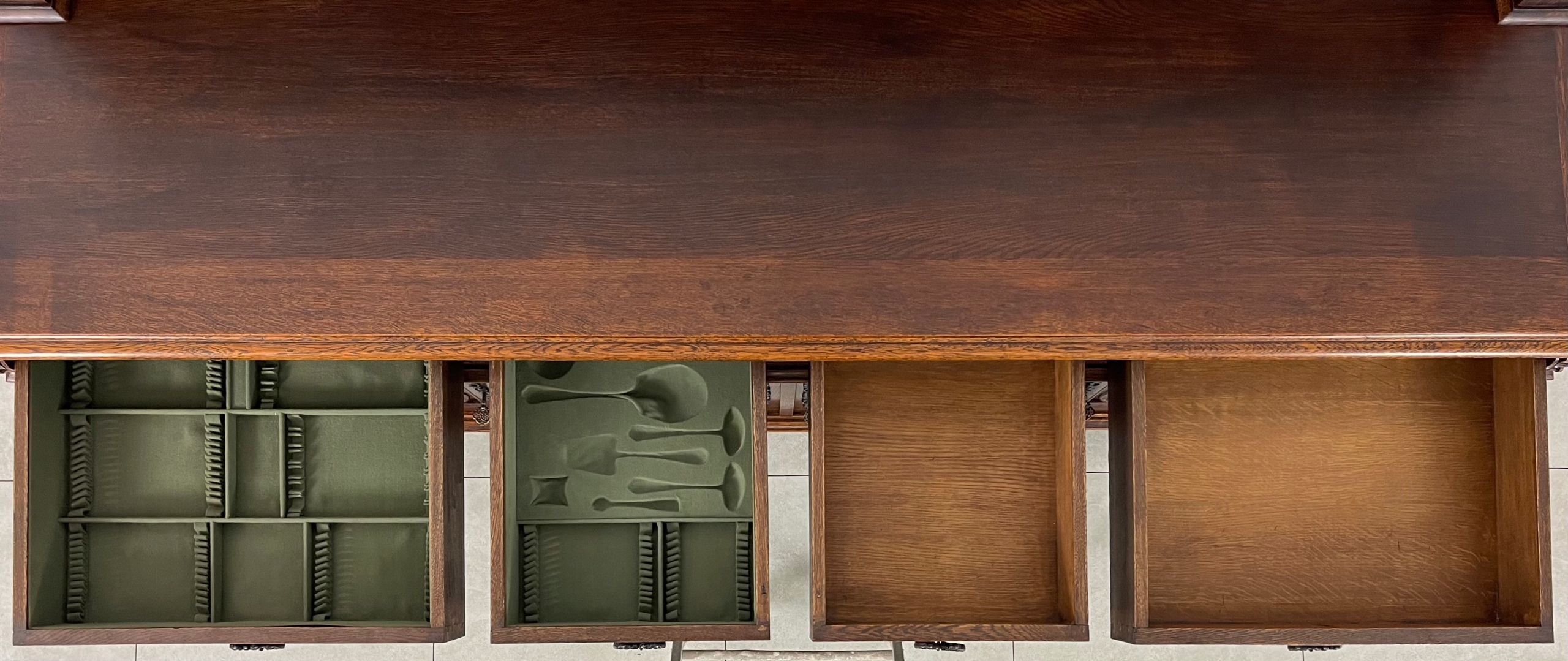 Мебель имеет четыре ящика в верхней части, один из которых оснащен отсеками, идеально подходит для хранения столовых приборов или мелких предметов.
