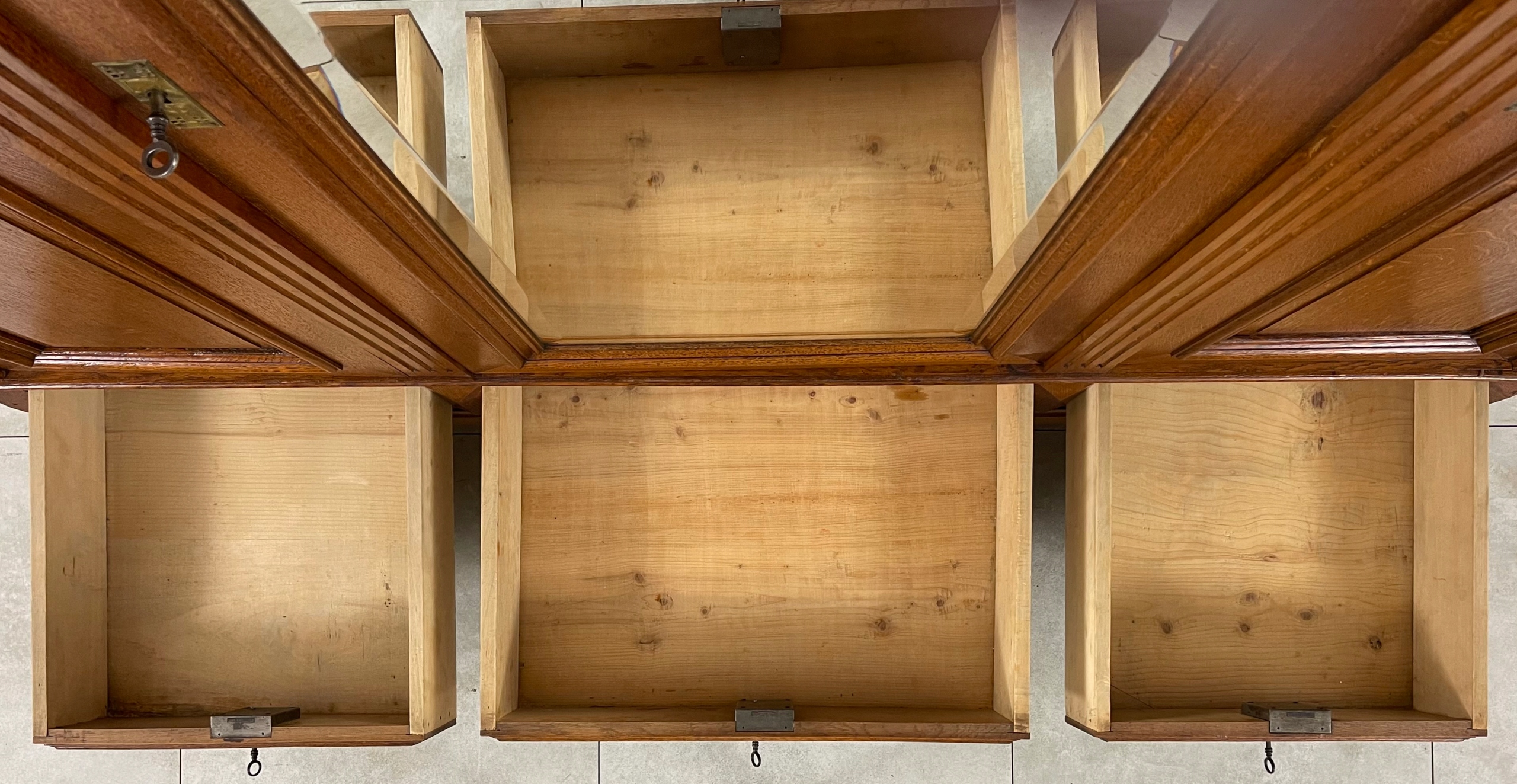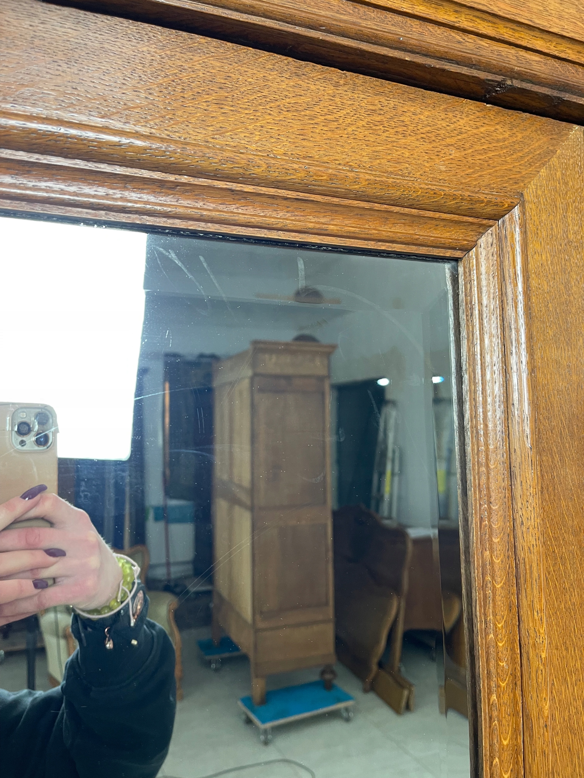 Мебель имеет оригинальное, хрустальное зеркало с взбитыми краями, от эпохи. Зеркальная поверхность в хорошем состоянии, хотя под светом справа, в верхнем углу мы можем увидеть нежные полосы, возникающие в результате прохождения времени (см. Последнее прикрепленное фото) и несколько маленьких черных точек, расположенных в середине зеркала в замке.