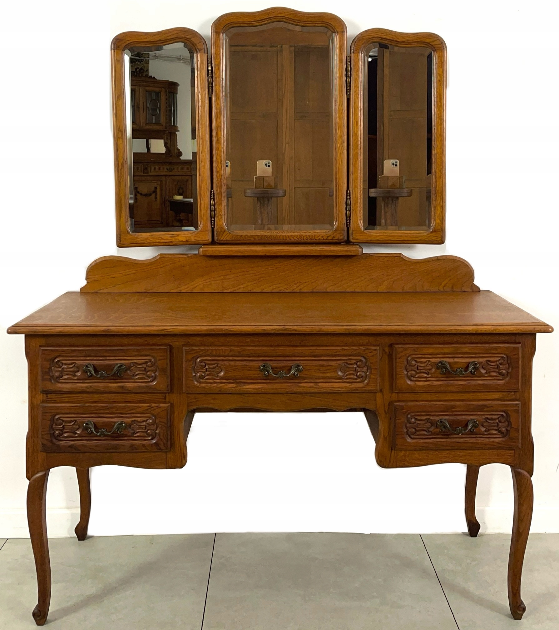 Верхняя часть туалетного столика представляет собой тройное хрустальное зеркало. Зеркало скошено и родом из той эпохи. Дубовая рама, две подвижные створки.
