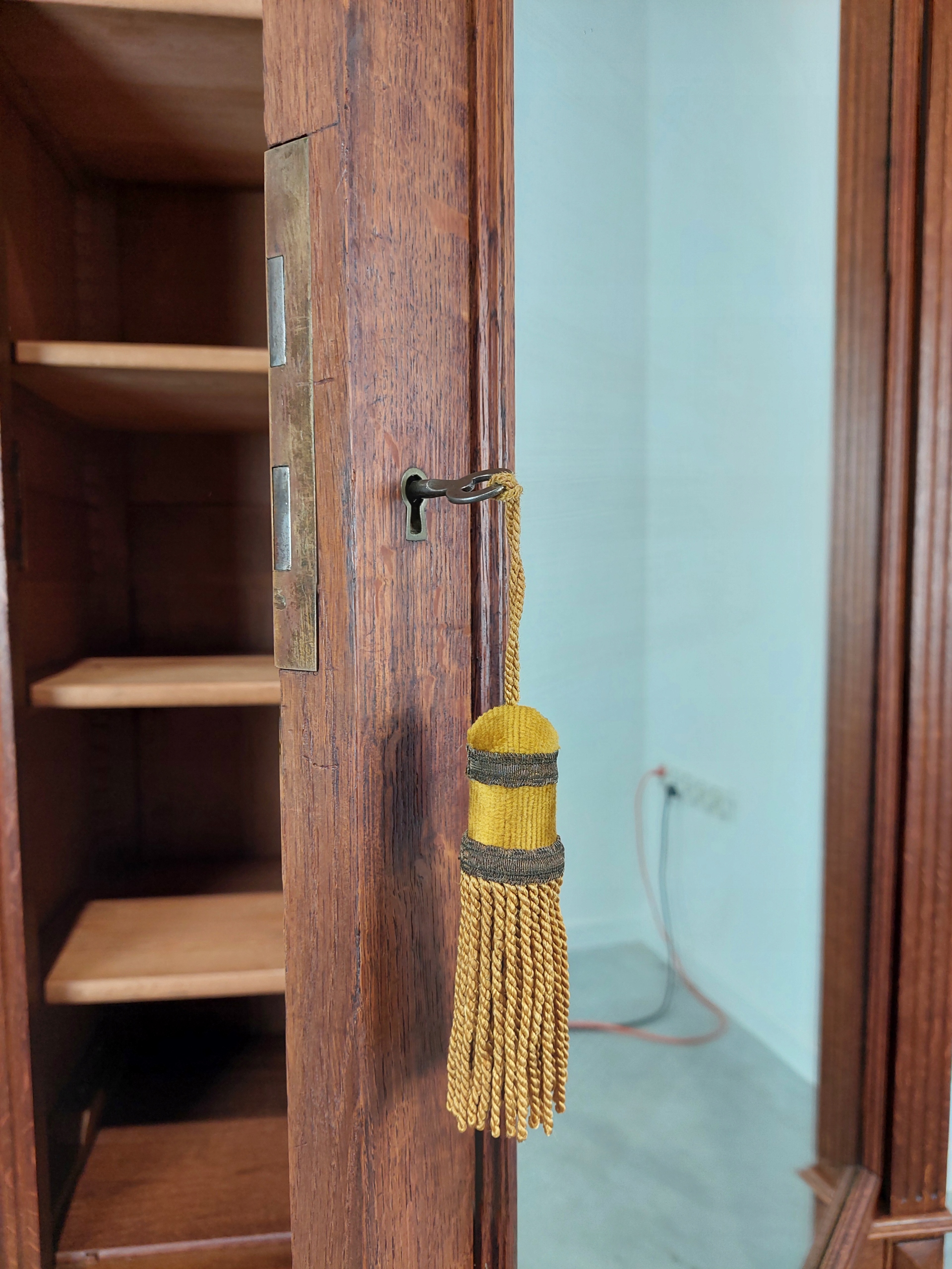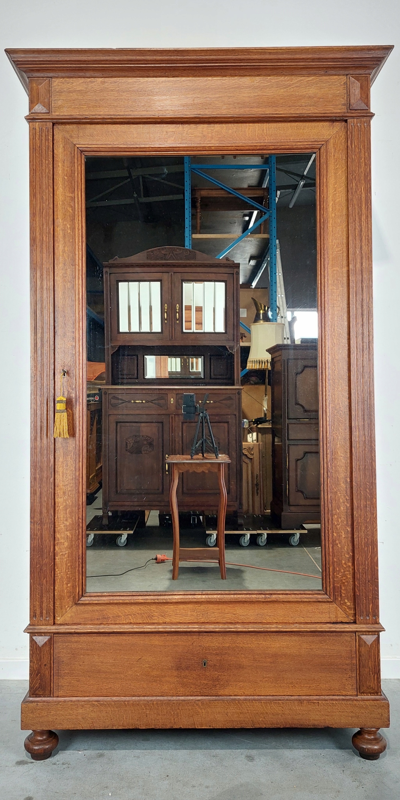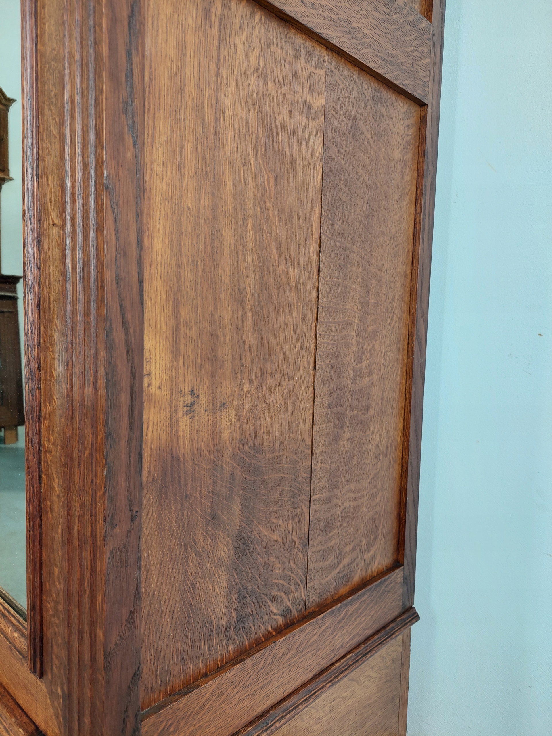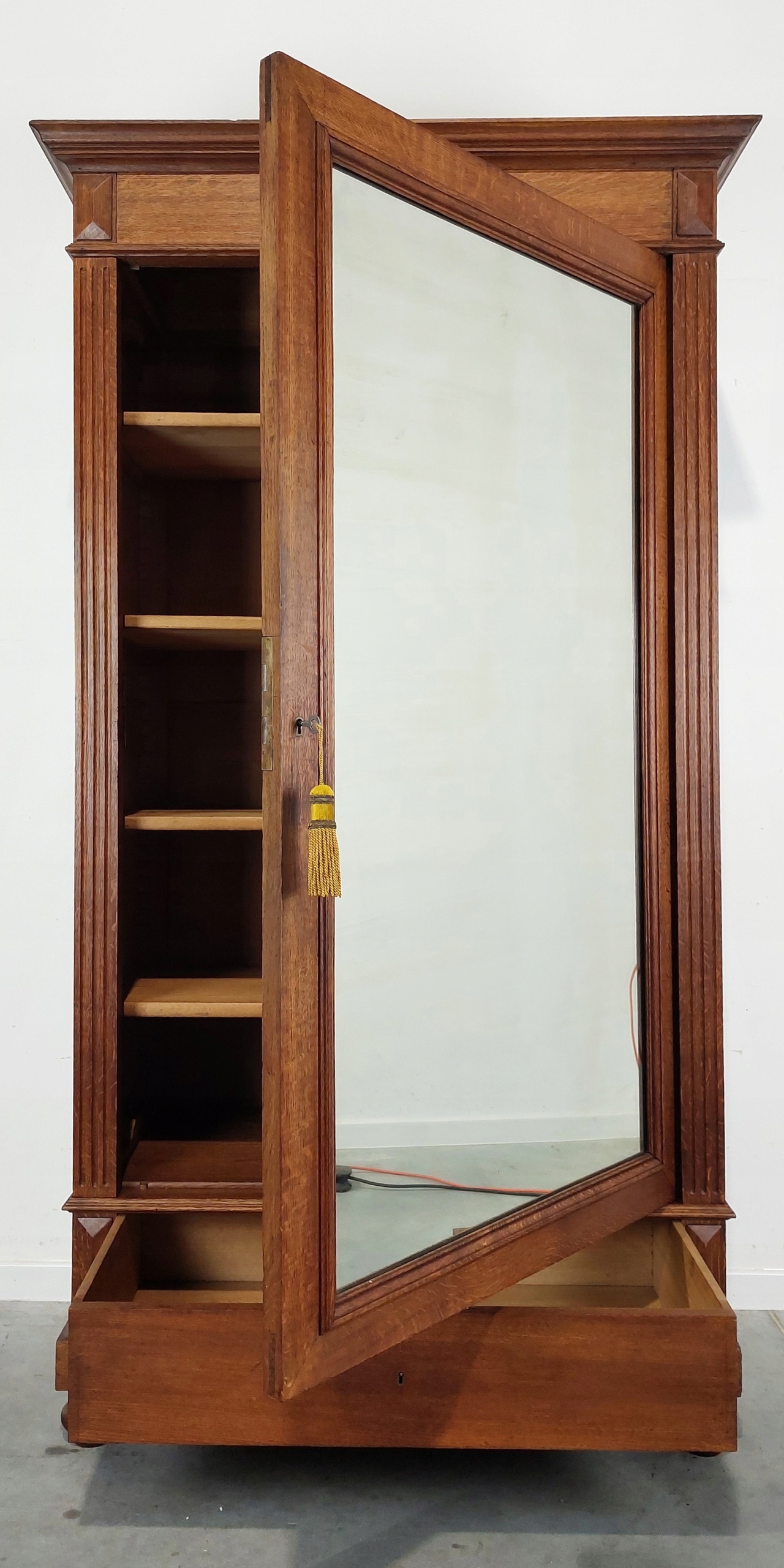 Стильный одностворчатый шкаф – шкаф-купе в стиле эклектика из дуба. Дата производства 1902 г. (есть идентификационный номер). Мебель имеет типичные следы использования, видимые на фотографиях, правая сторона - просыхание. Замки рабочие, ключ в комплекте. При закрывании дверь следует немного приподнять, а затем закрыть (в случае одностворчатых шкафов с зеркалом это стандартная проблема, так как хрустальные зеркала значительно тяжелее нынешних. Чтобы решить эту проблему, можно придать конструкции жесткость и собрать мебель стационарно, например, прикрепить ее к стене). Внутри четыре хорошие регулируемые деревянные полки. Хрустальное зеркало, в хорошем состоянии, учитывая, что ему 123 года. Для транспортировки шкаф разбирается. Подробные фото ниже.