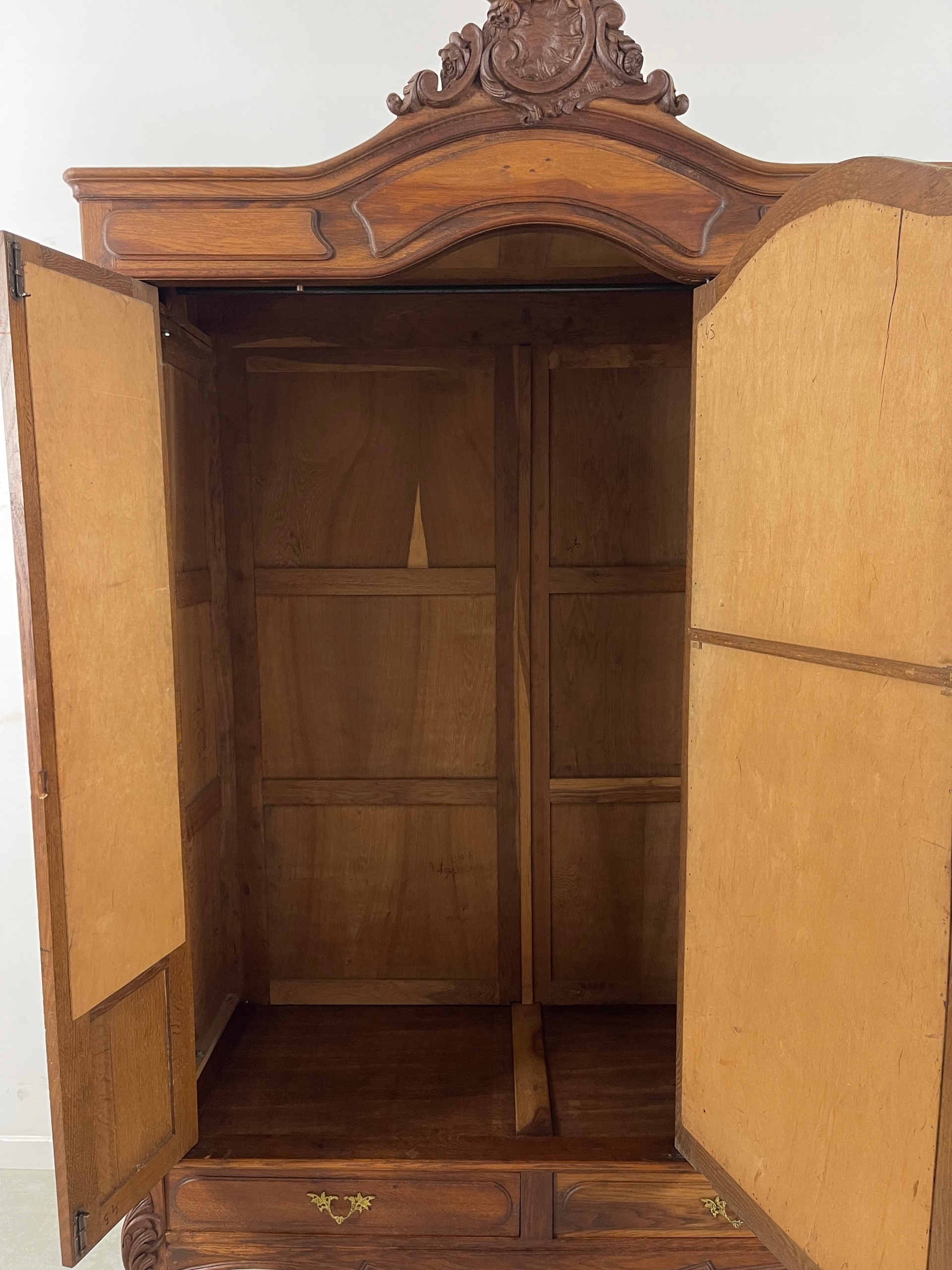 гардероб, украшенный скульптурами, медными фитингами и увенчанный великолепным орнаментом, характерным для стиля. Это выглядит очень впечатляюще, и благодаря деталям, сделанным с большой заботой, он уникален и уникален.