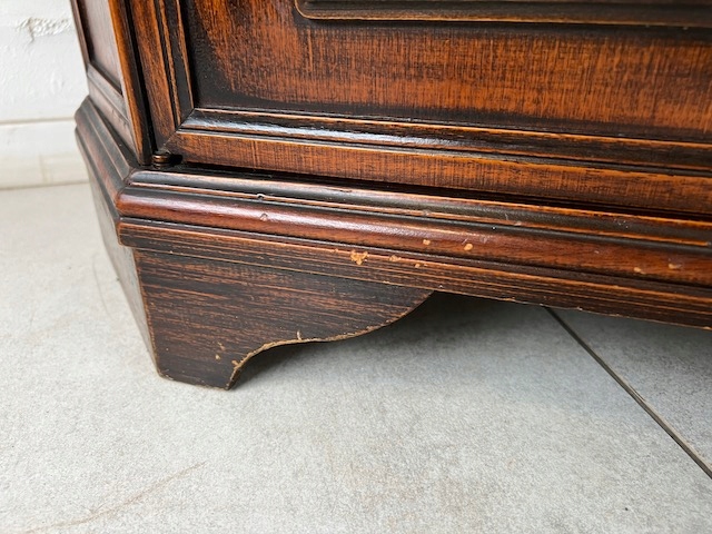 Стильный комод. Его форма трапециевидная. Он в хорошем состоянии. Повреждений и дефектов нет. На нем видны типичные следы использования; мелкие царапины и потертости. На столешнице имеется небольшое изменение цвета. Готово к установке.