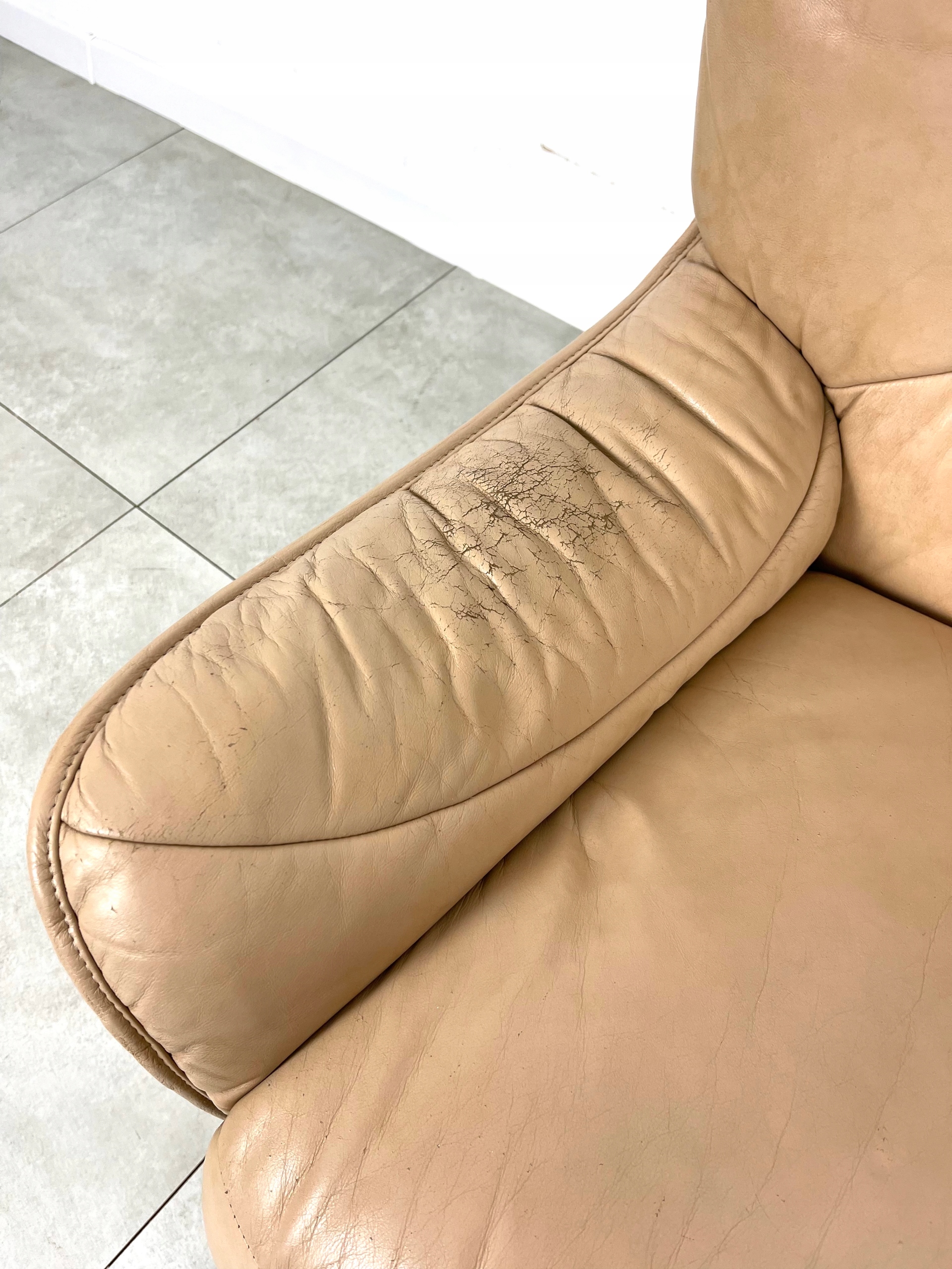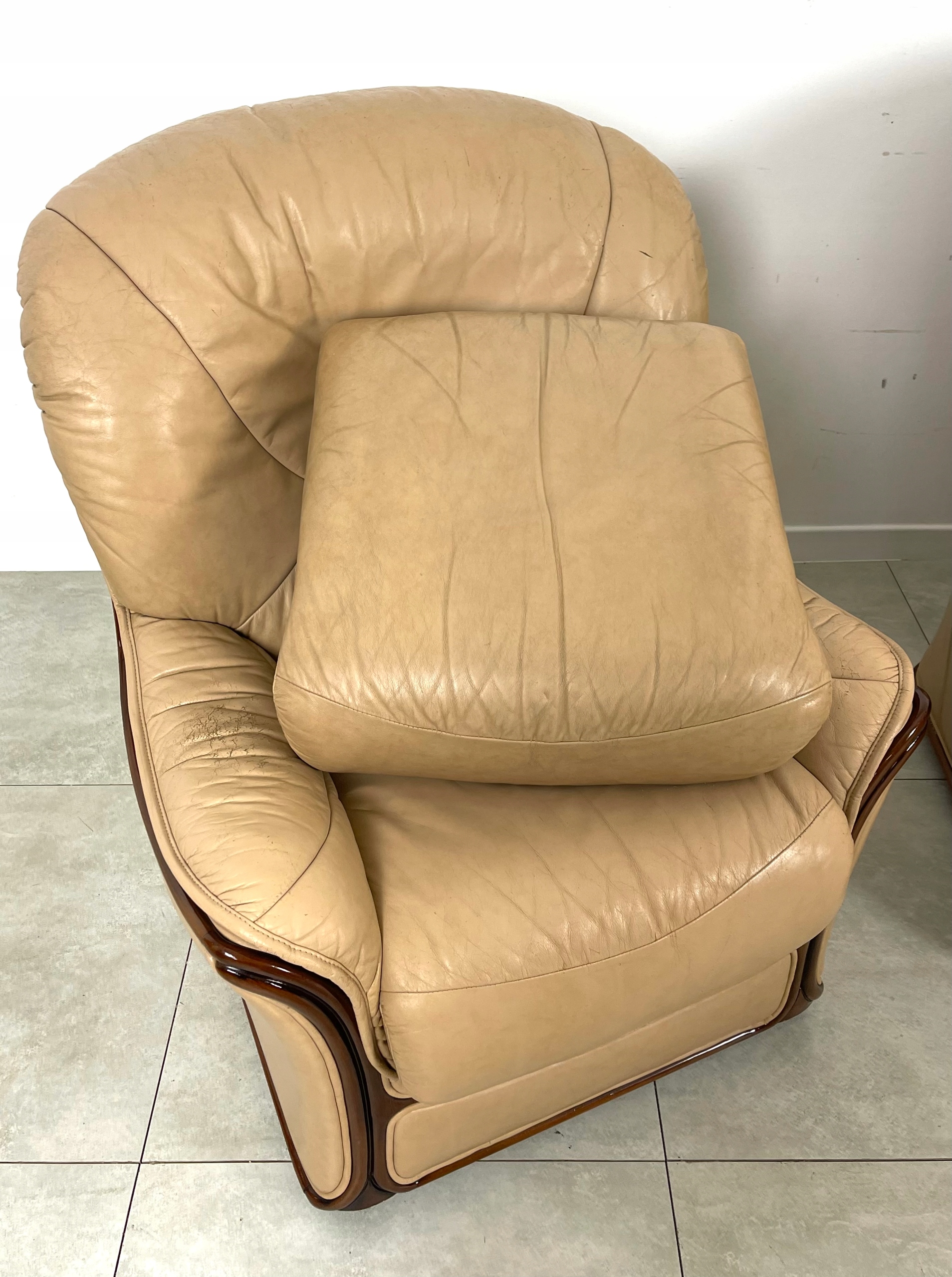 Каркас мебели изготовлен из древесины бука, обивка кожаная в оригинальном состоянии.