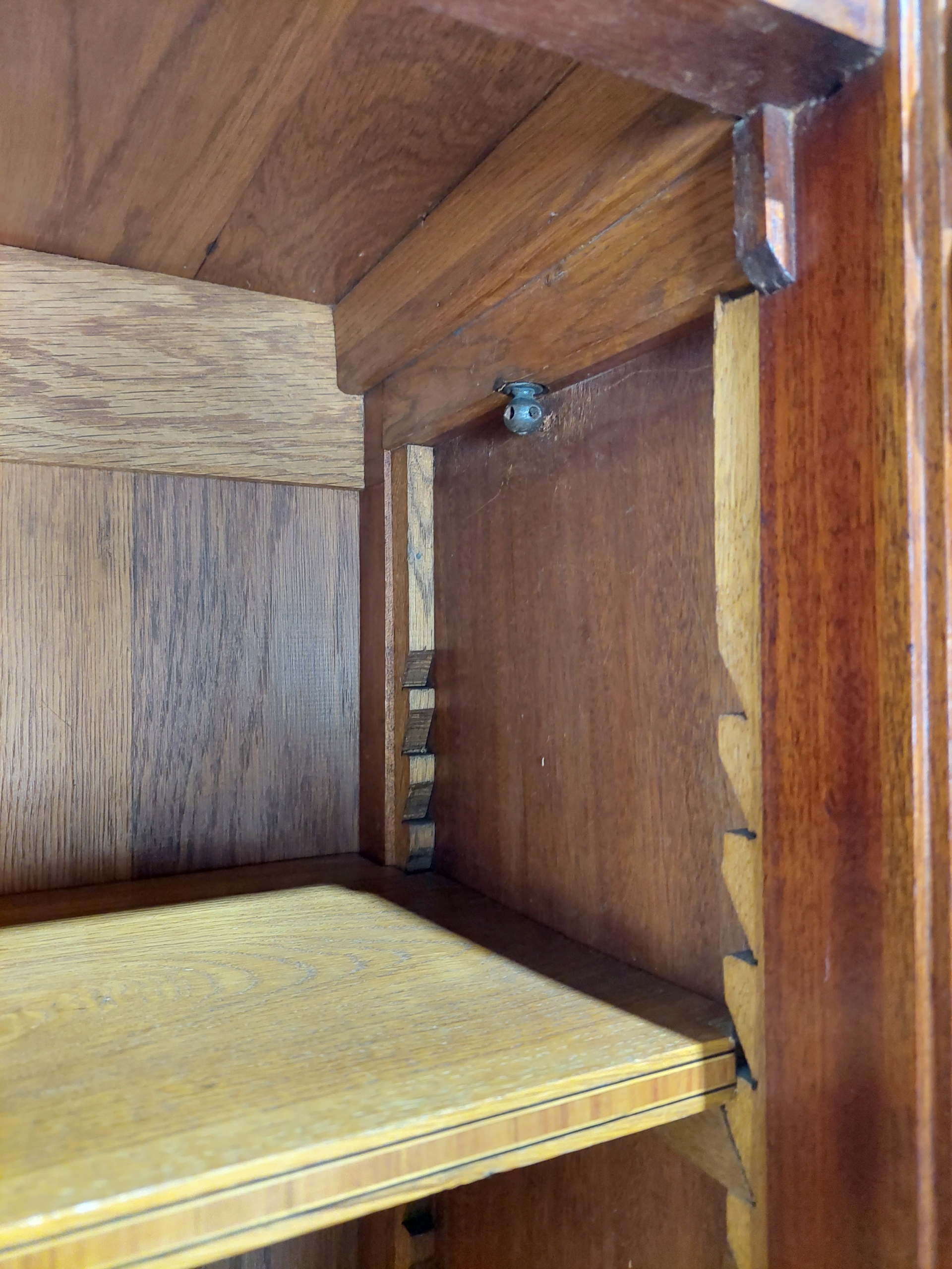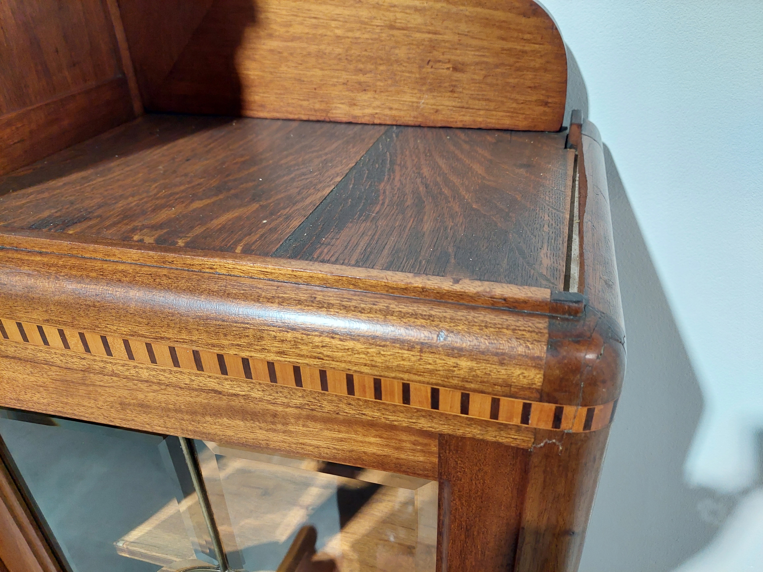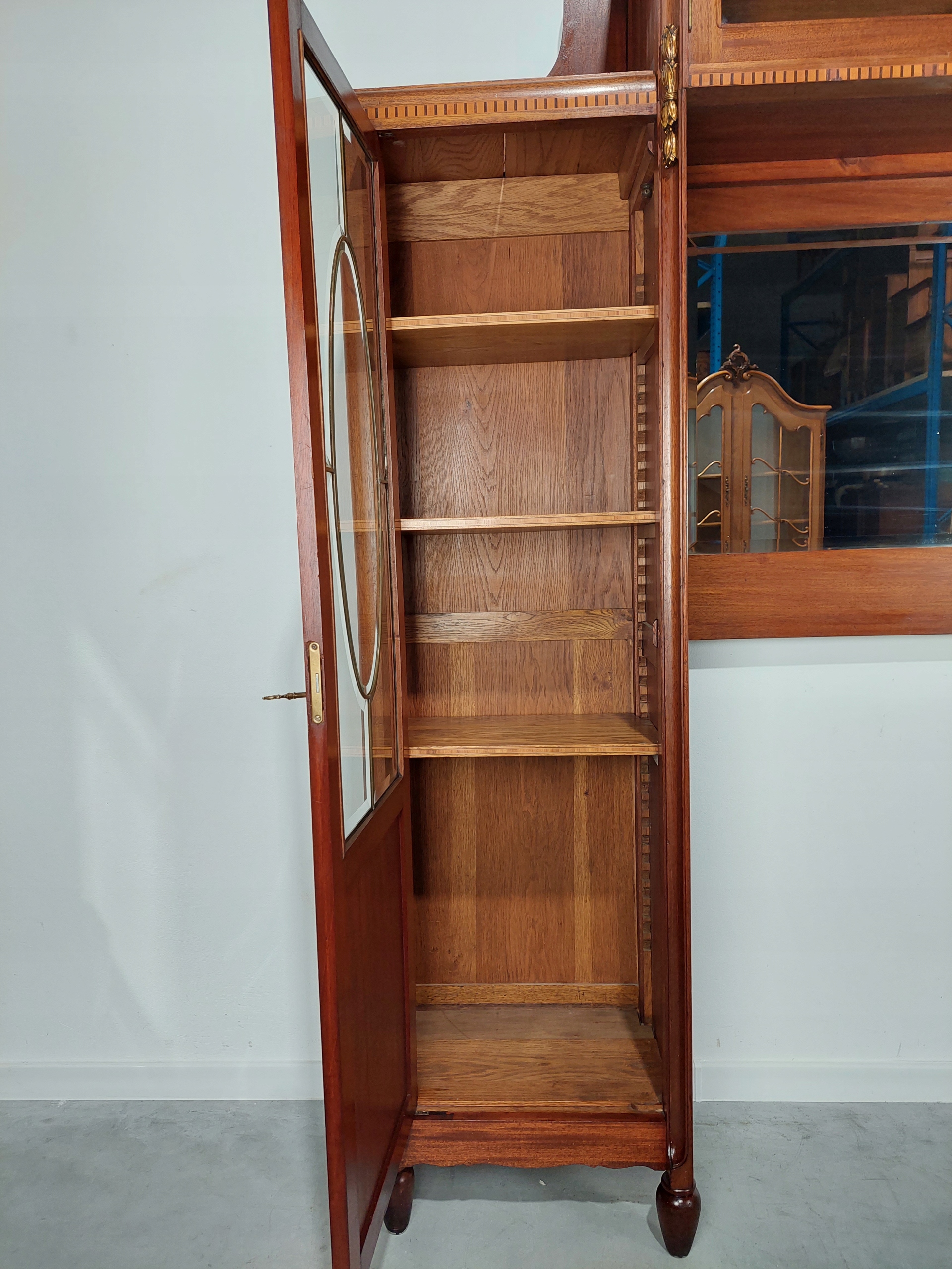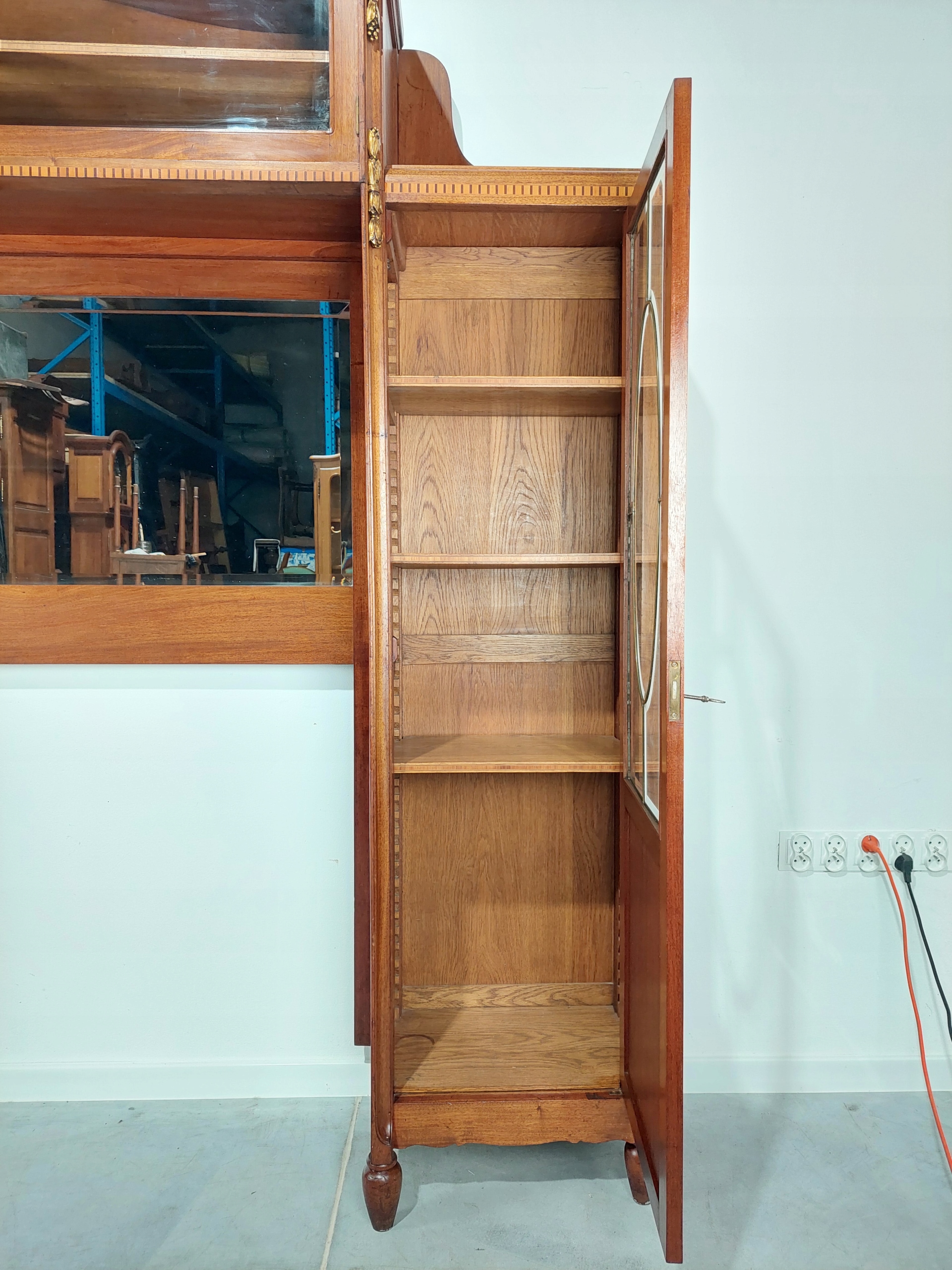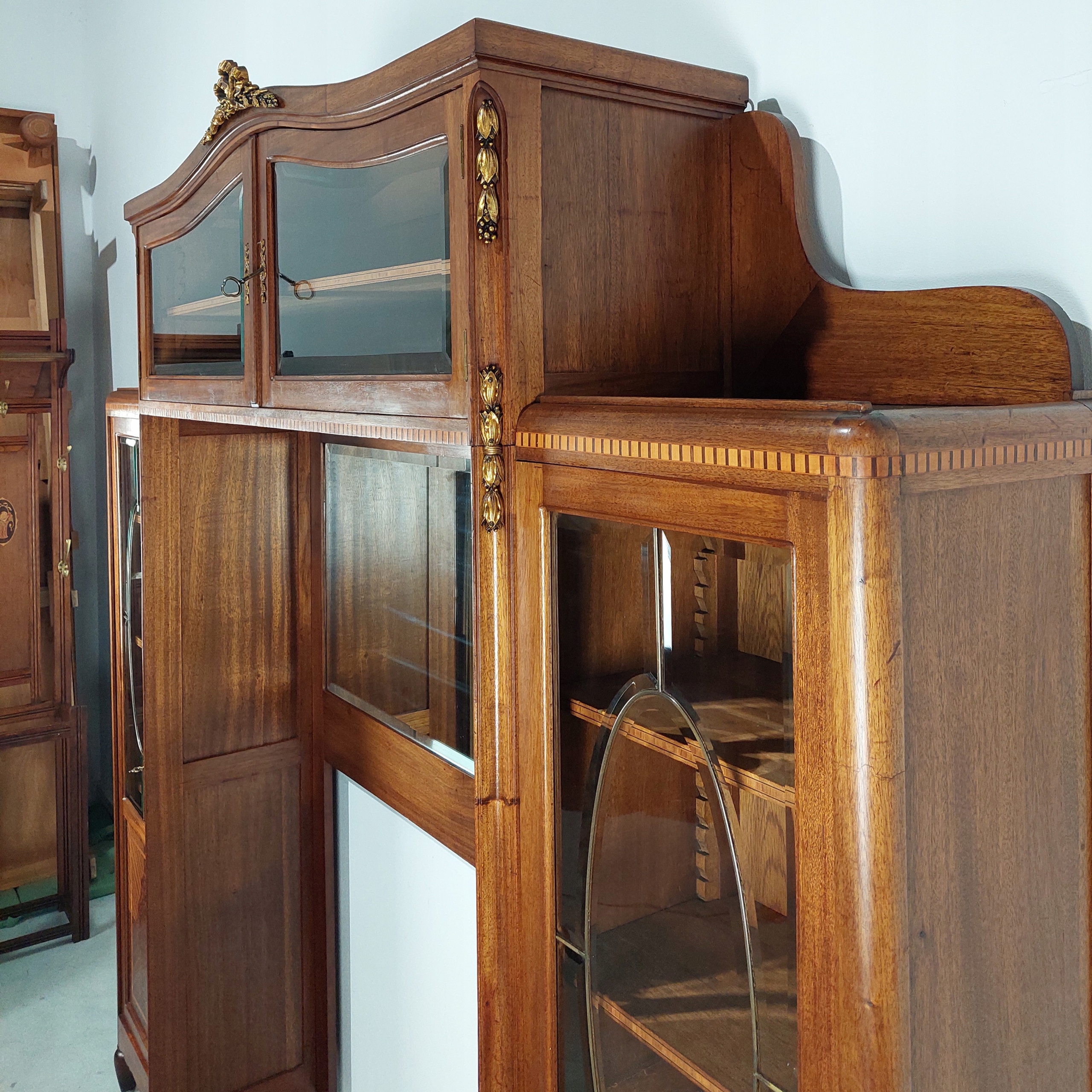 Стильная библиотека/кабинет/туалетный столик в стиле ампир Из Франции. Вы можете разместить в нише письменный стол и использовать его как кабинет, также можно приспособить его под парикмахерскую/парикмахерскую, добавив столешницу под зеркало, или использовать как туалетный столик. Все стекла с фаской. Мебель из орехового дерева, инкрустация. Он имеет следы использования/ремонта (из-за возраста мы оцениваем его примерно в 90/100 лет), такие как царапины, потертости и высыхание (верхняя часть сегментов). Высоту полок можно свободно регулировать. Конструкция в разобранном виде и время транспортировки (4 элемента отдельно: 2 дымохода и приставка, зеркало) Подробные фото ниже