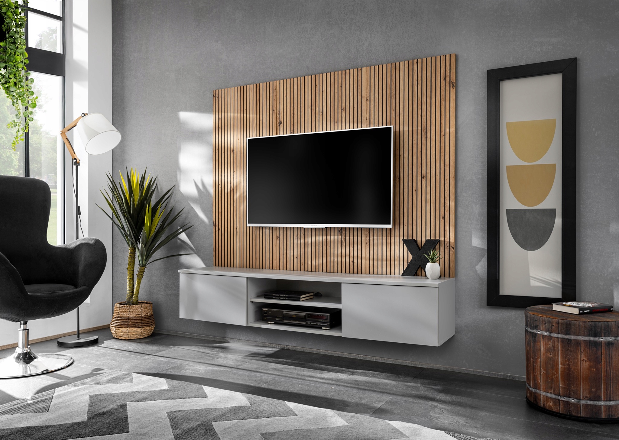 настенная панель с печатными черными полосами и отверстие для телевизора.