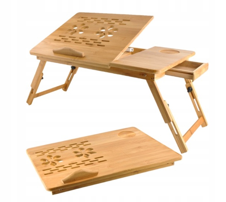 Складной, чрезвычайно практичный деревянный столик для ноутбука. Благодаря ему вы достигнете небывалого комфорта при работе и игре на своем ноутбуке! Высокий комфорт работы обеспечивается регулируемой регулировкой высоты и наклона (до 4 уровней). Он имеет специальную опору, которая предотвращает случайное соскальзывание компьютера во время его использования даже при большом угле наклона! Стол дополнительно оснащен ящиком для хранения мелких предметов, например носителей информации. Кроме того, его можно идеально использовать в спальне в качестве стола для завтрака или для чтения книг или рисования детьми. Забудьте о риске перегрева ноутбука или использования его в неудобном положении! Стол обеспечивает оптимальную вентиляцию оборудования благодаря специальным отверстиям в столешнице, гарантируя соответствующий комфорт работы!