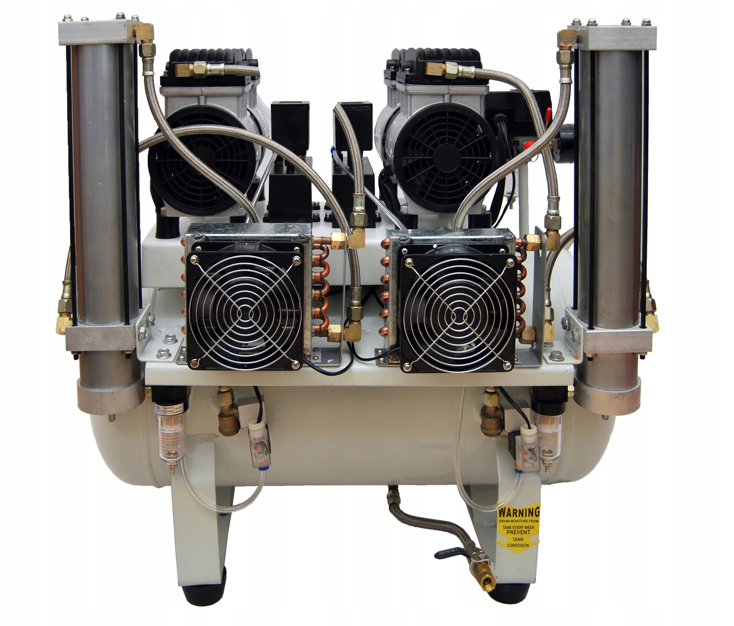 Профессиональный поршневый компрессор без белка с адсорбирующим осушителем. Адаптируется к работе в лабораториях, медицинских, стоматологических и протезных кабинетах. Невозможным в местах, где требуется источник сжатого, идеально сухого и воздуха воздуха. Два безмонтальных насоса, используемые в компрессоре, чрезвычайно тихие и эффективные, и использование радиатора еще больше улучшило параметры всего устройства. Компактная конструкция с интегрированным осушителем делает его идеальным решением для офисов с небольшим количеством места, а низкие уровни шума (55 дБ) позволяют устанавливать непосредственно на рабочем месте. Операционный дружелюбный, простой в обслуживании. Суперэффективный и современный компрессор с баком, эмалированным изнутри, позволяет подключить несколько стоматологических единиц или других устройств, требующих чрезвычайно чистого и сухого воздуха. Материалы высочайшего качества и проверенные компоненты делают компрессор очень важным и надежным.