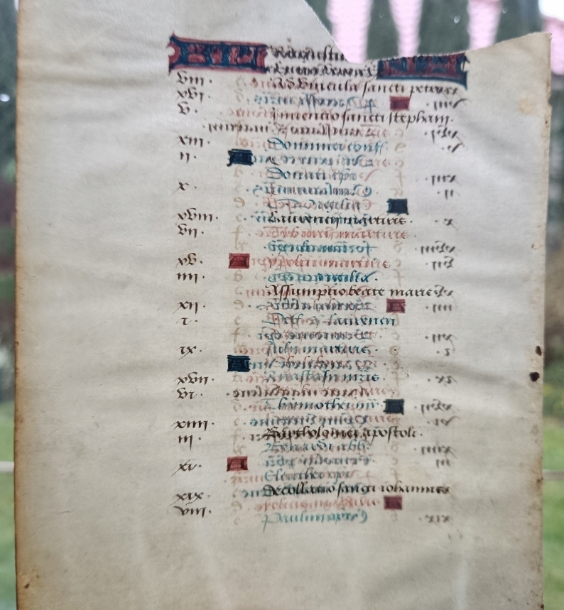 Календарь 14-го века (мы предполагаем, что это примерно 1350 год, хотя он может быть и старше). Календари настолько редки, что Часы или требники могли иметь несколько сотен страниц, но в данной рукописной книге всегда было только 6 или 12 календарных страниц. Страница была повреждена - как на фотографии, но с небольшим. отсутствует текст/инициал.