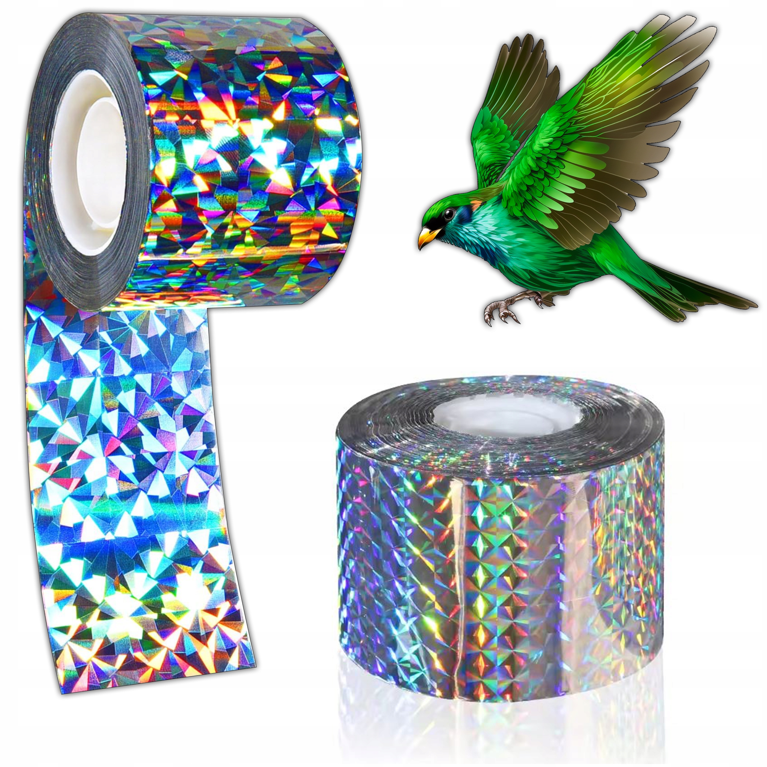 Простой и экологический способ отталкивания птиц. Инновационный метод отталкивания ленты голограммы. Поверхность ленты отражает рассвет и создает неприятный металлический звук для птиц, преследуя его из места, где они не должны быть