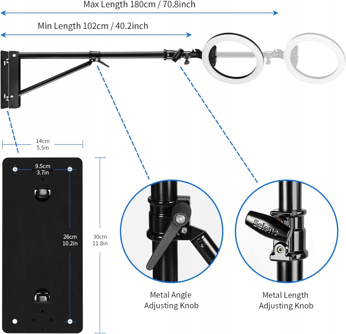 Регулируемый угол и длина: Треугольный кронштейн для настенного крепления можно повернуть на 180°, что позволяет быстро менять положение лампы, а угол можно свободно регулировать в соответствии с различными требованиями к записи. Регулируемая длина позволяет вы сможете плавно выдвинуть ручку со 100 см до 180 см.