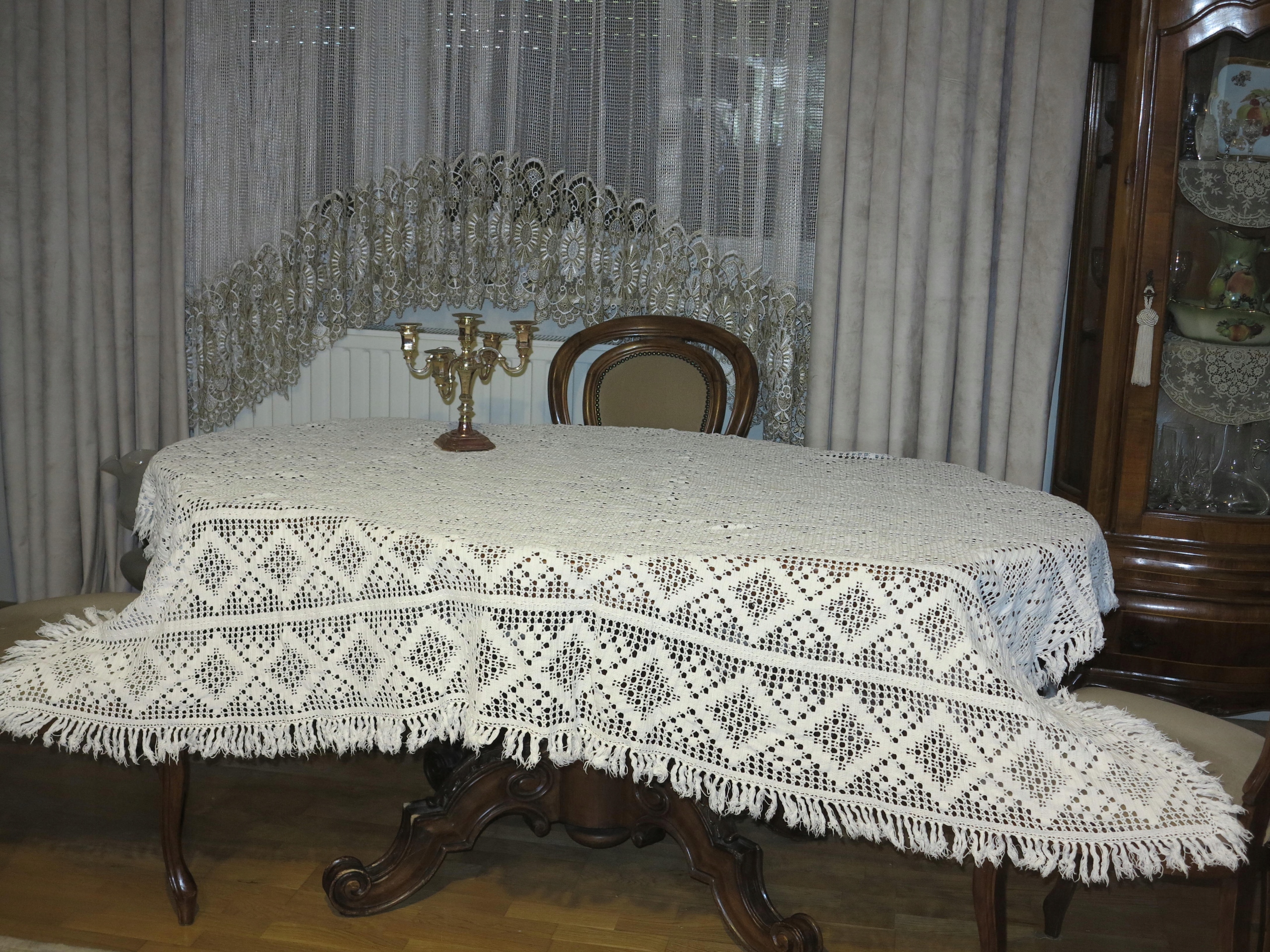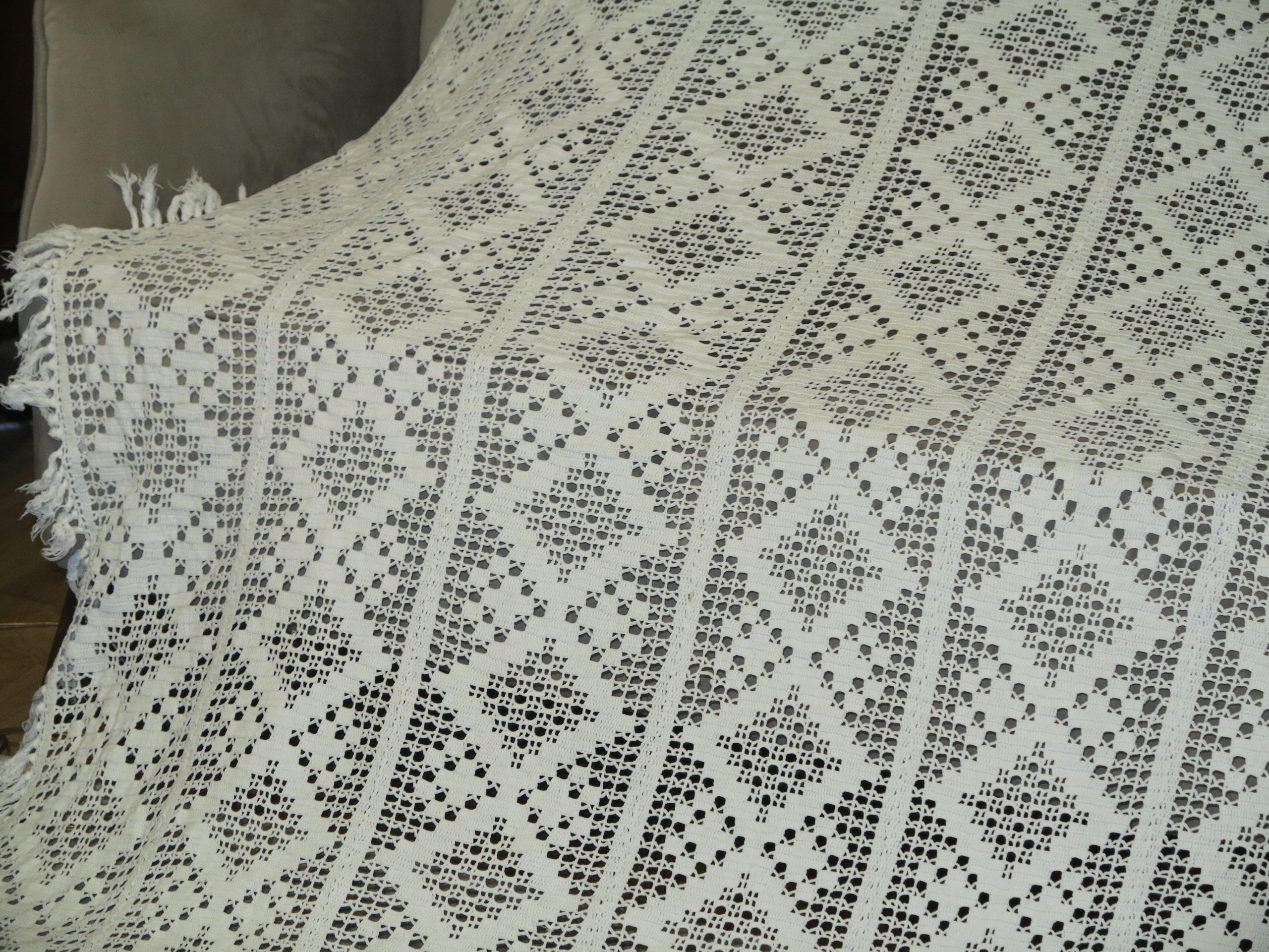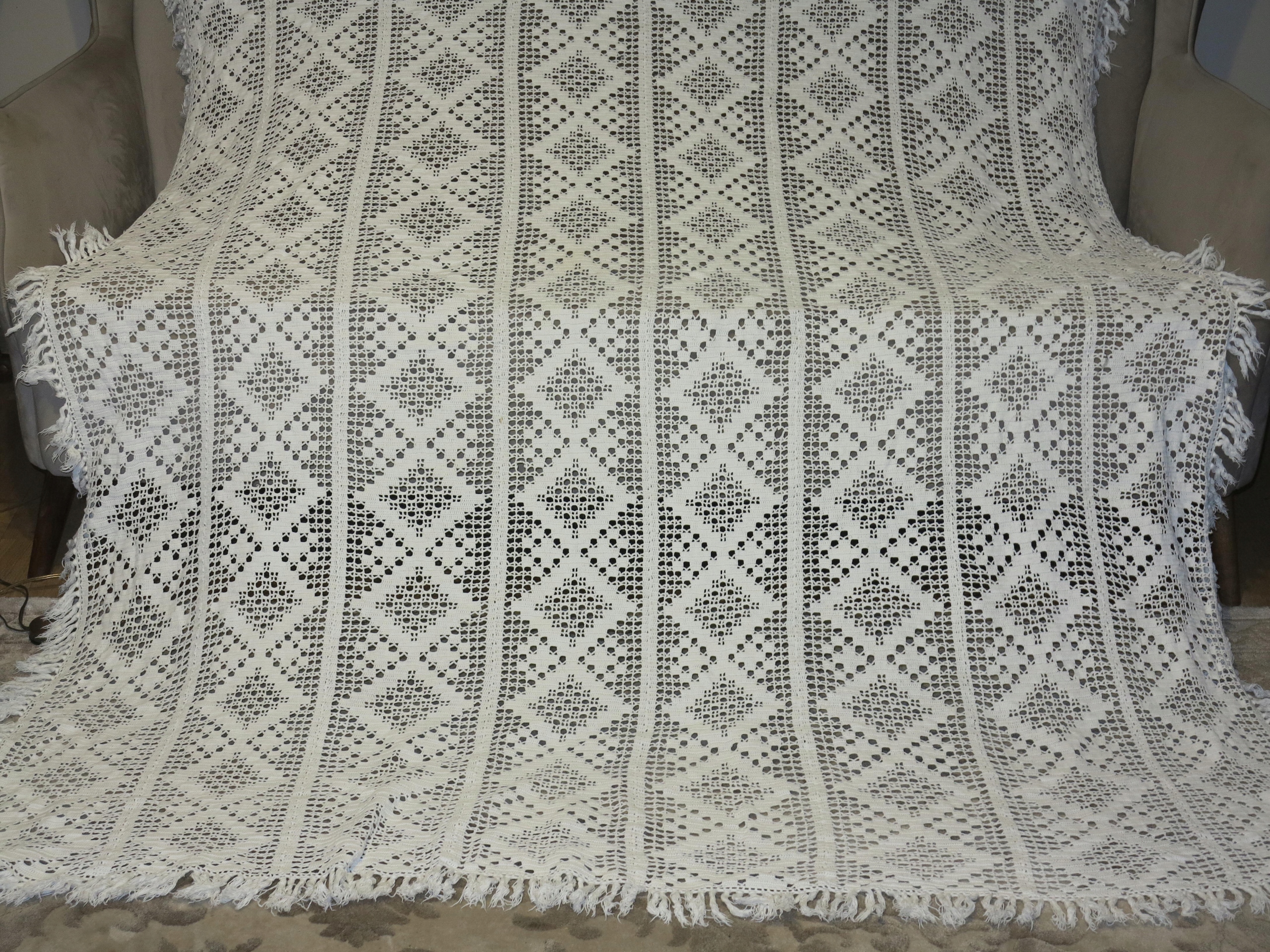 Объект аукциона - прекрасная скатерть или кора на кровати на кровати, полностью ручной работы. Это очень приличная вещь, толстая и твердая. Он имеет размеры: 192 см, ширина: 153 см плюс 7 см. Используется скатерть, в супер хорошем состоянии и качестве. Я рекомендую, отличное украшение стильного интерьера