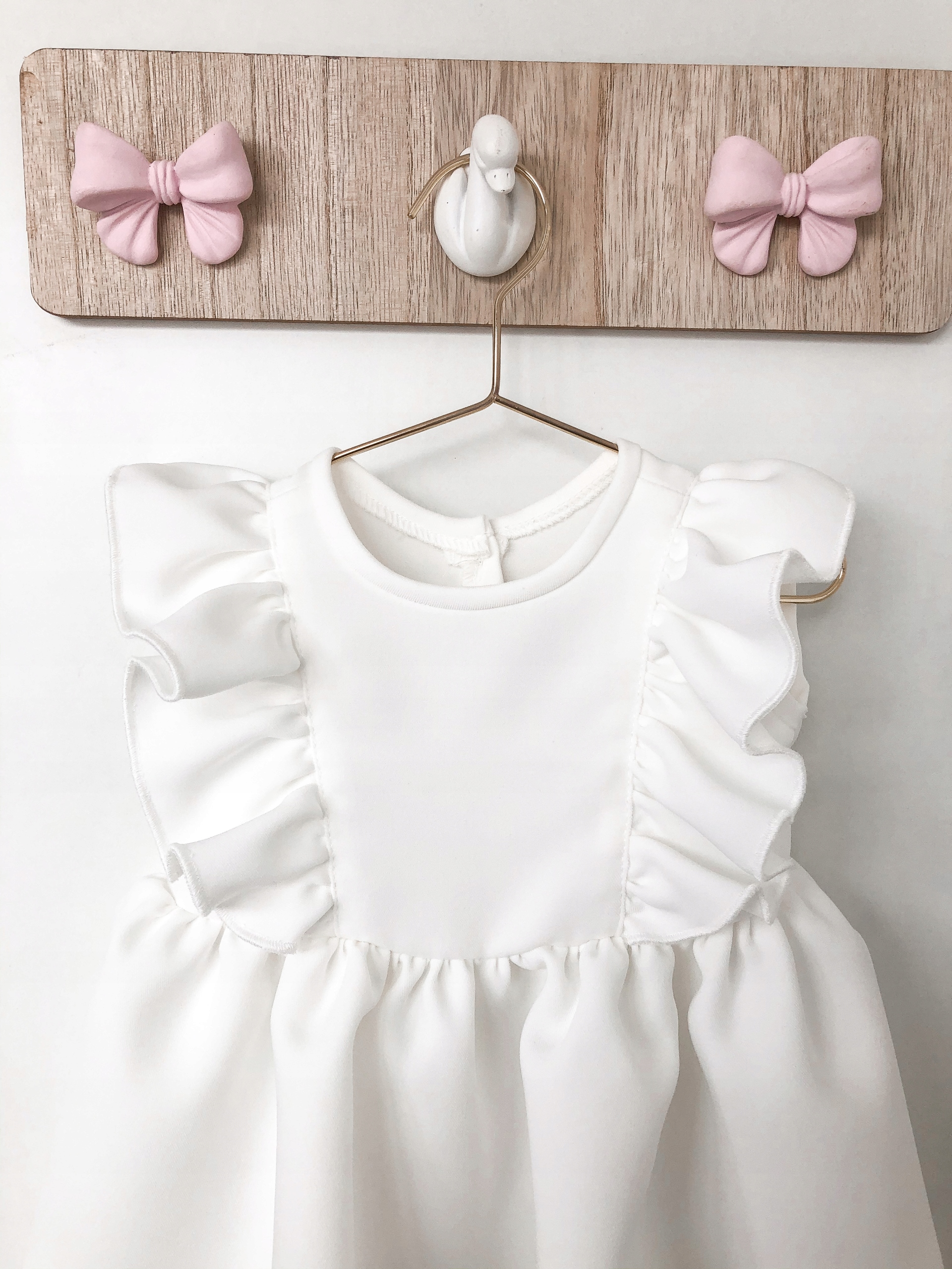 Нежное крестильное платье кремового цвета с очаровательными рюшами. Застегивается сзади на три золотые пуговицы. Минималистичный и вневременной стиль.