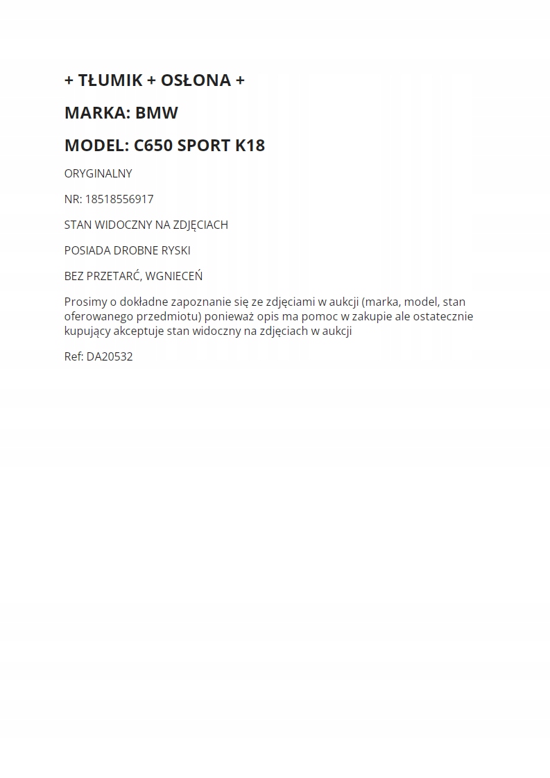 Просматривая «Silencer + Cover 18518556917 BMW C650 Sport K18», вы можете быть уверены, что данный товар из каталога «Глушители» будет доставлен из Польши и проверен на целостность. В цене товара, указанной на сайте, учтена доставка из Польши. Внимание!!! Товары для Евросоюза, согласно законодательству стран Евросоюза, могут отличаться упаковкой или наполнением.