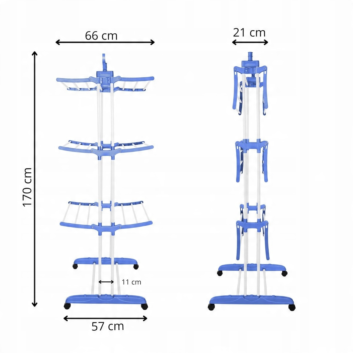 С тремя платформами для развешивания белья и впечатляющим количеством трубок - po 8 на каждой платформе наша сушилка предлагает непревзойденную универсальность. Вы можете свободно размещать белье на разных уровнях, адаптируя расположение к вашим индивидуальным потребностям и пространству в вашем доме. Благодаря колесам при необходимости сушилку можно легко переместить в более подходящее место — даже при полной загрузке бельем.
