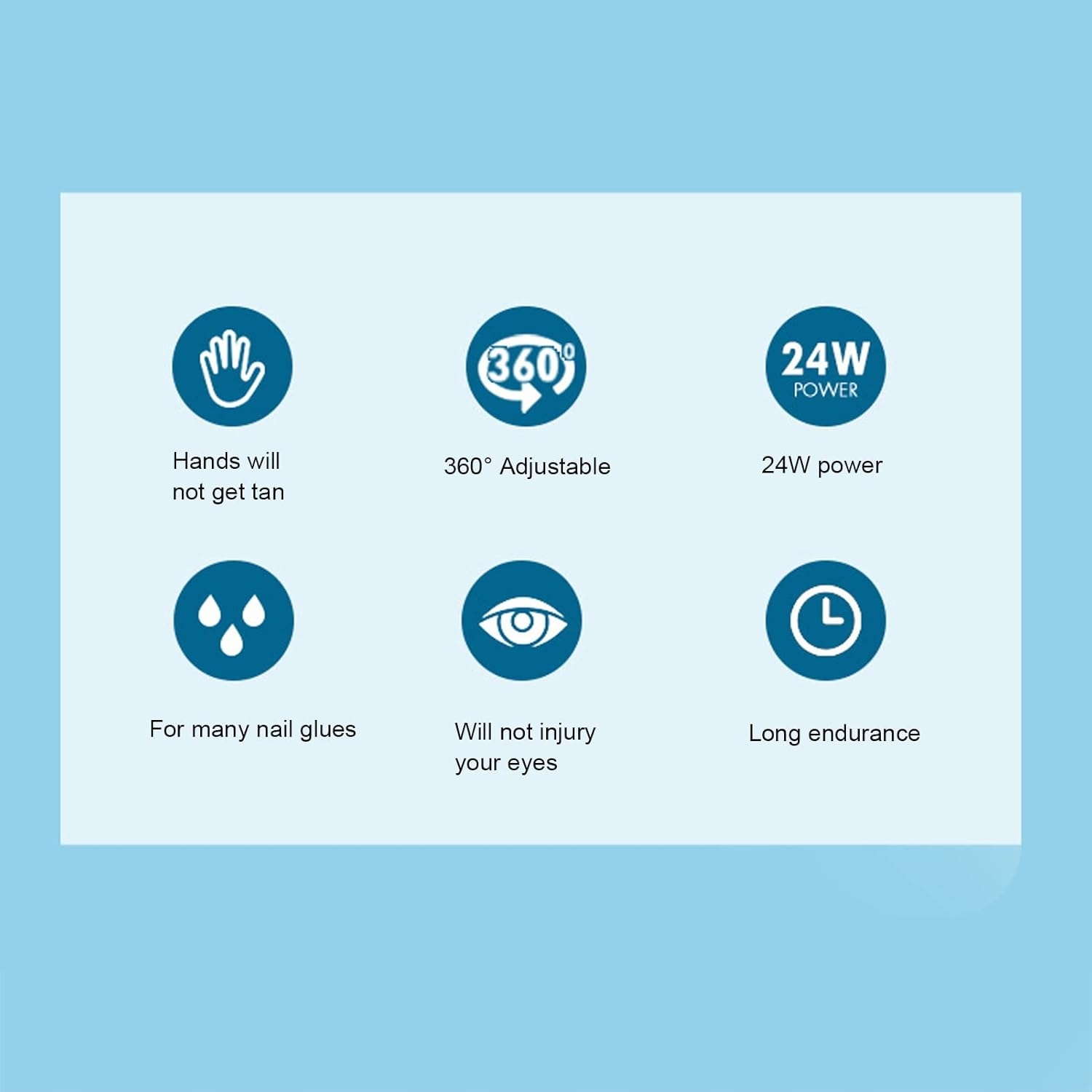 Быстросохнущая гуманизированная лампа для отверждения ногтей может освободить ваши руки, быстро высушить руки без мертвого угла, что удобно в использовании. Гибкая гусиная шея Лампа для сушки ногтей с гибкой трубкой, которую можно регулировать на 360 градусов в зависимости от угла сушки ногтей и которую можно использовать бесплатно. Лампа для отверждения геля для ногтей с 8 световыми полосами и 8 светодиодными полосками оснащена двойным чересстрочным источником света для отверждения клея для ногтей, что обеспечивает эффективное повышение эффективности. Легкость подключения Оснащен кабелем питания Type-C, он обладает большой универсальностью, как и интерфейс зарядки мобильного телефона, и имеет неограниченное перемещение. Широкое использование. Сушилка для геля для ногтей чрезвычайно удобна в ношении, подходит для маникюрного салона или для домашнего использования, идеально подходит для любителей ногтей и начинающих мастеров маникюра.