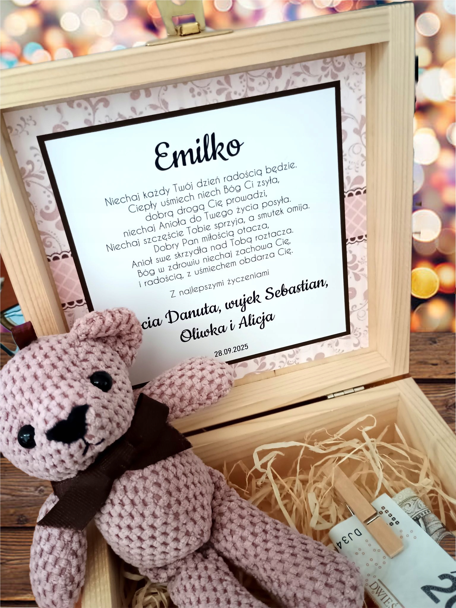 Деревянная коробка с персонализированными пожеланиями и место для наличных денег с плюшевым мишками.