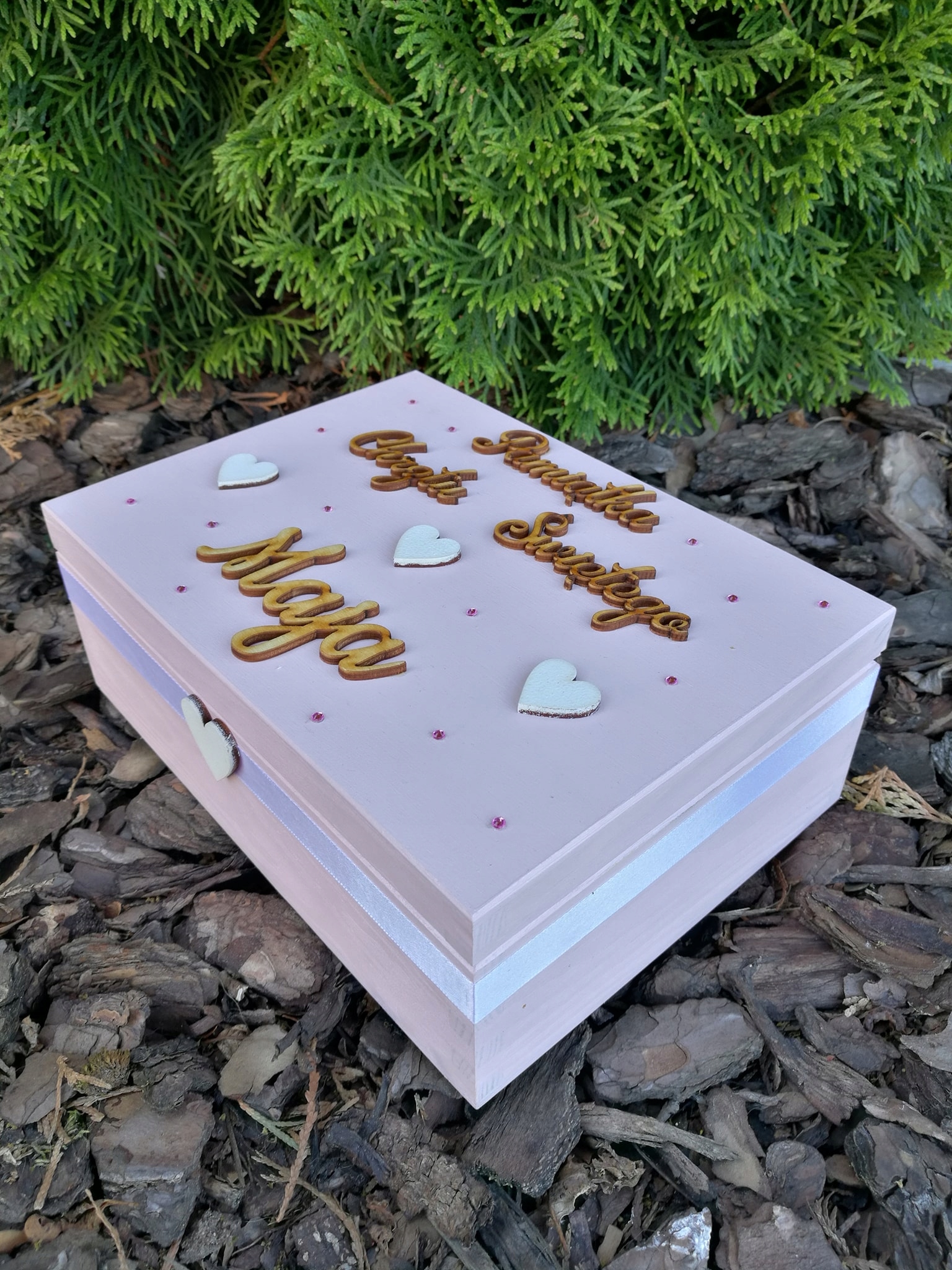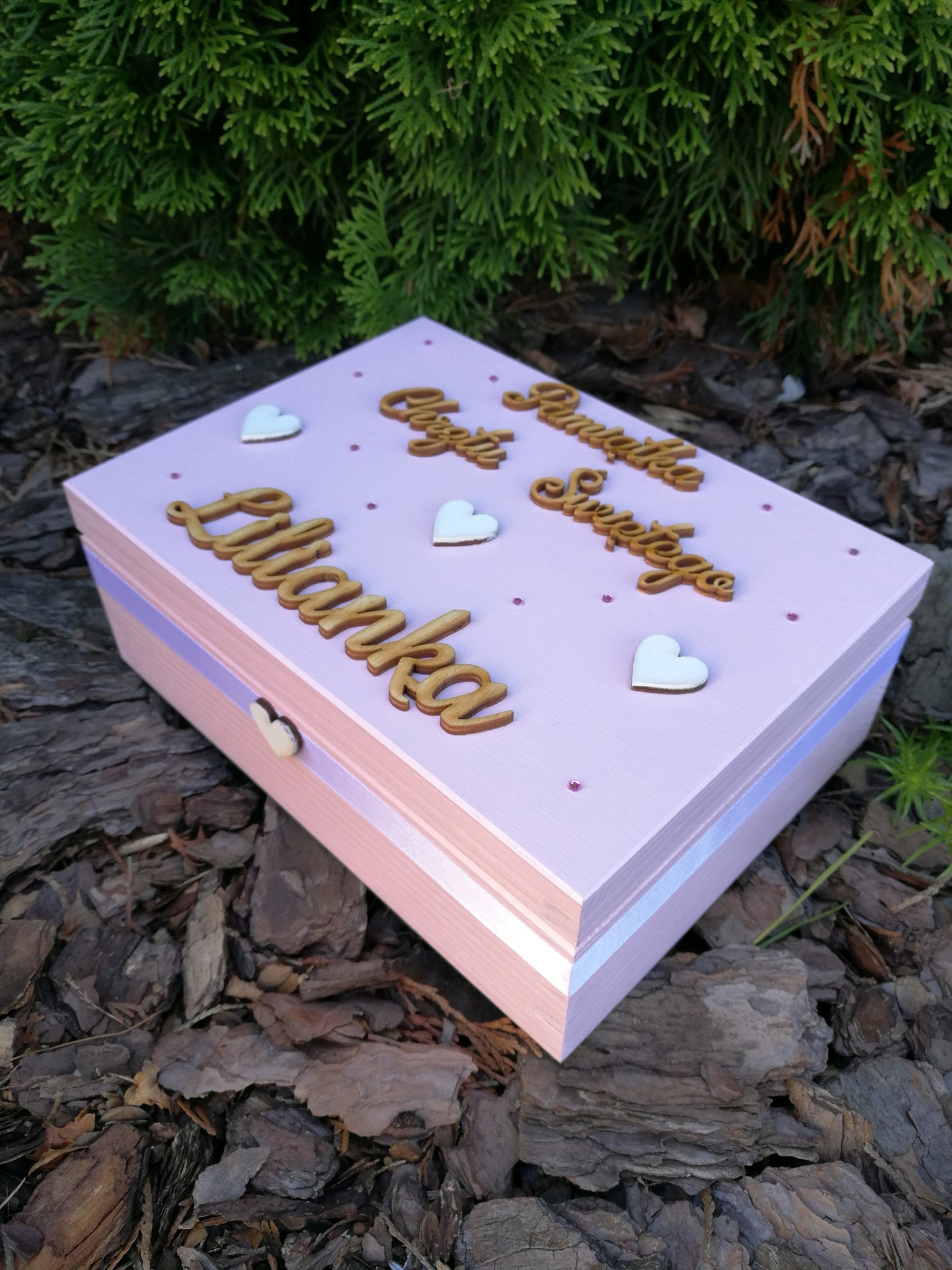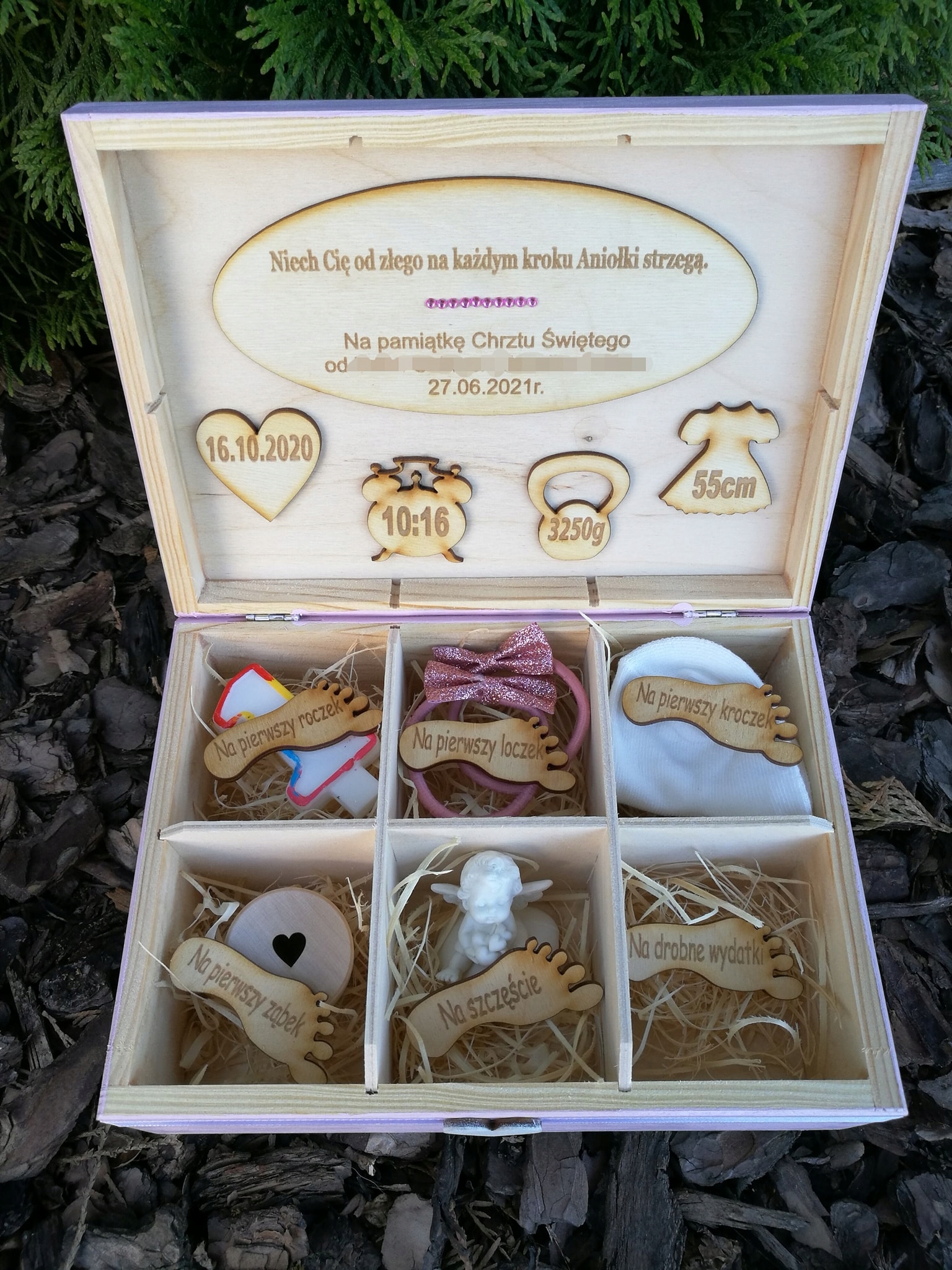Имя на крышке и табличка с пожеланиями и свидетельство о рождении внутри сделают ее уникальным подарком.