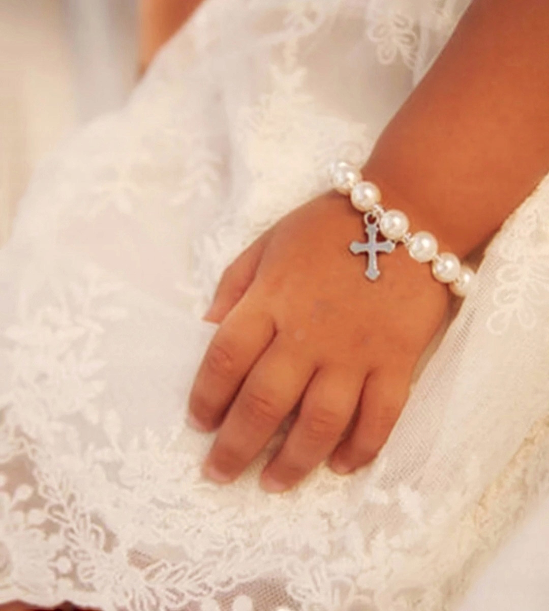 Красивый жемчужный браслет, помещенный в деревянную шкатулку – исключительно красивый подарок ребенку на Сувенир Святого Крещения, рождения ребенка или в качестве украшения.